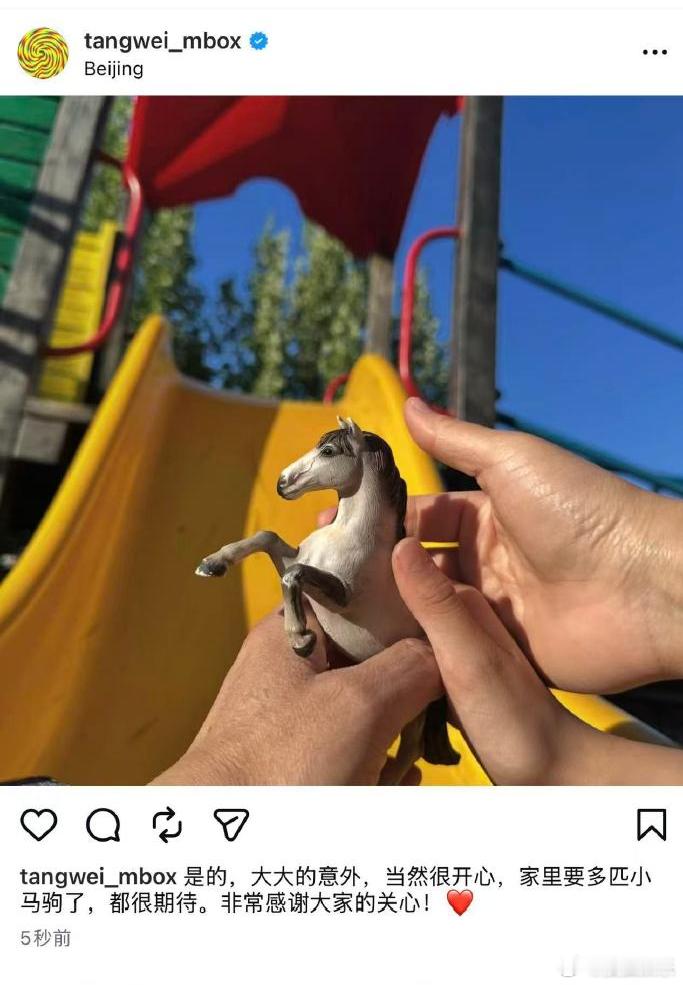汤唯本人也亲自在社交平台回应“是的,家里要多匹小马驹了,谢谢大家关心。”