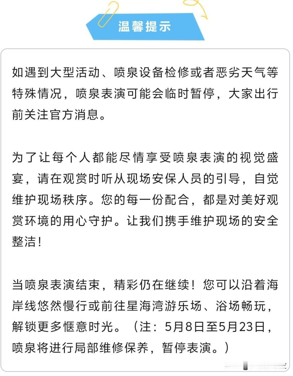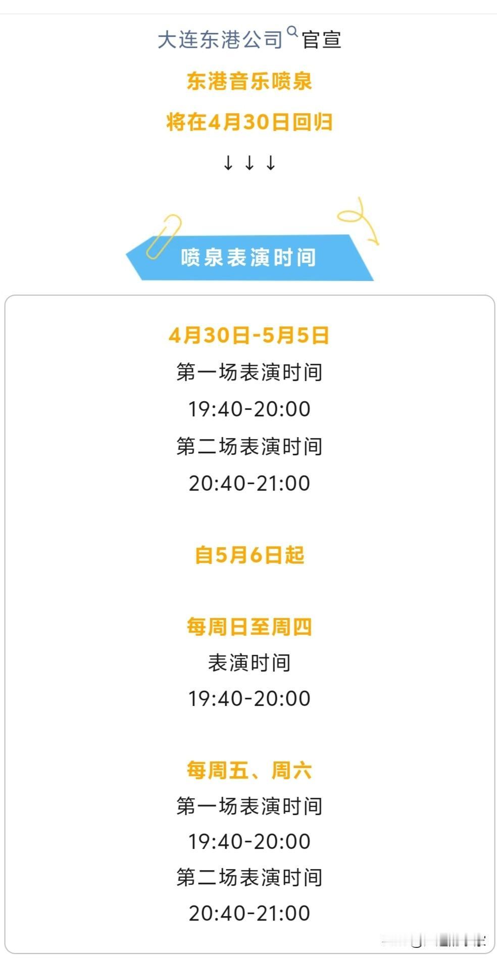 大连市内的东港和星海湾音乐喷泉将在今年五一假期期间恢复表演,五一假期期间每晚都有(天气不好和有活动除外),这也是为五一期间来大连旅游的游客准备的。