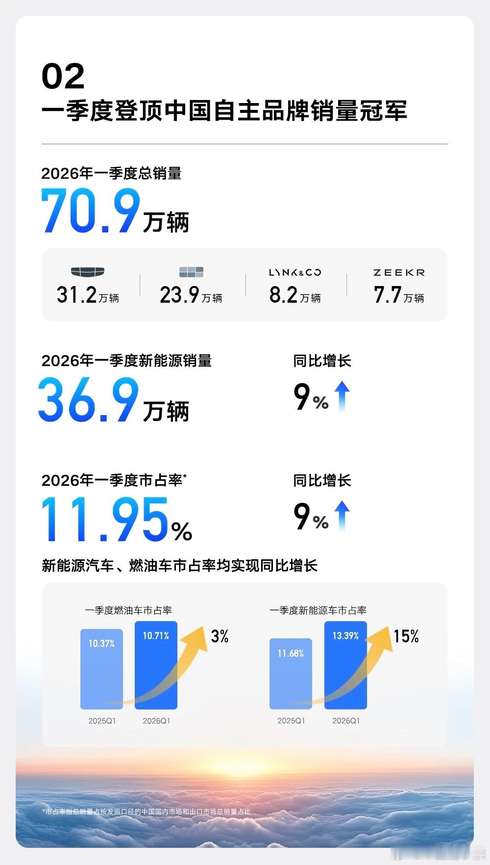 吉利汽车一季度营收首破800亿汽场全开2026北京车展 吉利公布一季度营收情况,一季度净利润超越比亚迪,成中国最赚钱的车企。吉利还是真猛,拿下多个一季度行业第一,在销收入、利润、国内出口销量增长明显。很多人说吉利以价换量,价格卷王,这下好了,可以闭嘴了吉利汽车