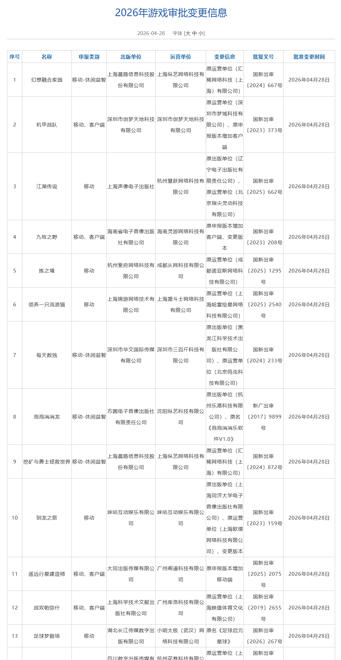 26年4月游戏版号发布 4月154款游戏版号发布 发游戏版号了——本次共计发放国产游戏版号147个,新增进口游戏版号7个,其他版号变更13款。值得关注的游戏有——《遗忘之海》:网易雷火,移动、客户端、游戏机(PS5)游戏《洛克王国:精灵牌》:腾讯《冰雪之笼》:巨人网络《冒险法则》:波克城市《锅锅英雄》:四三九九《火人冲冲冲》:凉屋科技《热血大武林》:电魂《妖灵打工团》:游卡《我功夫特牛2》《羊了个羊:乐园》