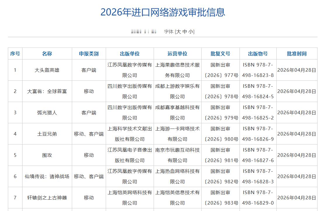 ※进口游戏版号《弧光猎人》:腾讯《ARC Raiders》《土豆兄弟》:游卡代理,幸存者like,移动、客户端《围攻》:基于物理的建造类游戏《仙境传说:诸神战场》:热血网络代理,移动、客户端《轩辕剑之上古神器》:恺英代理《大头盔英雄》:3d俯视角动作游戏