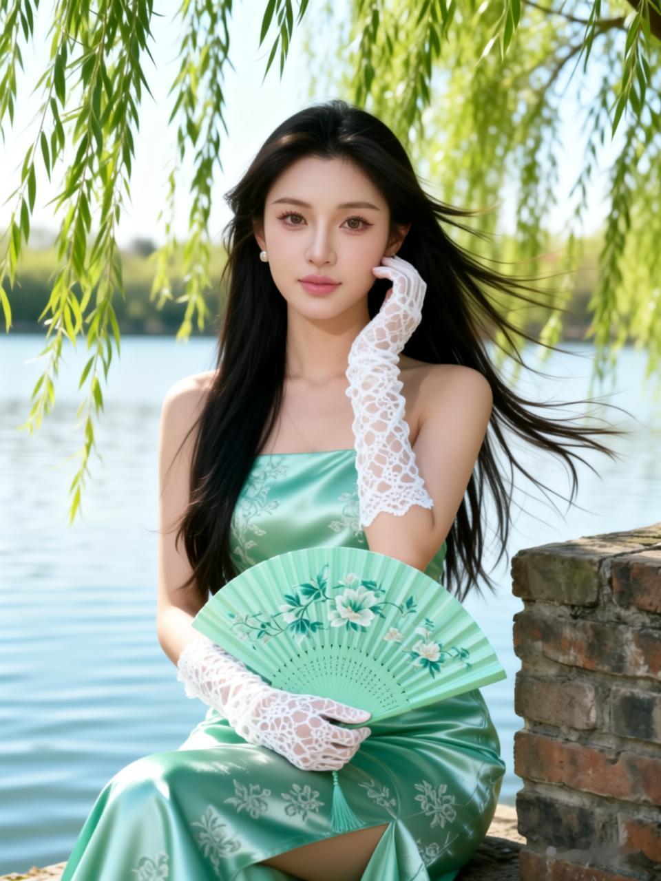 古风美人湖畔坐,绿裙飘飘似仙子。