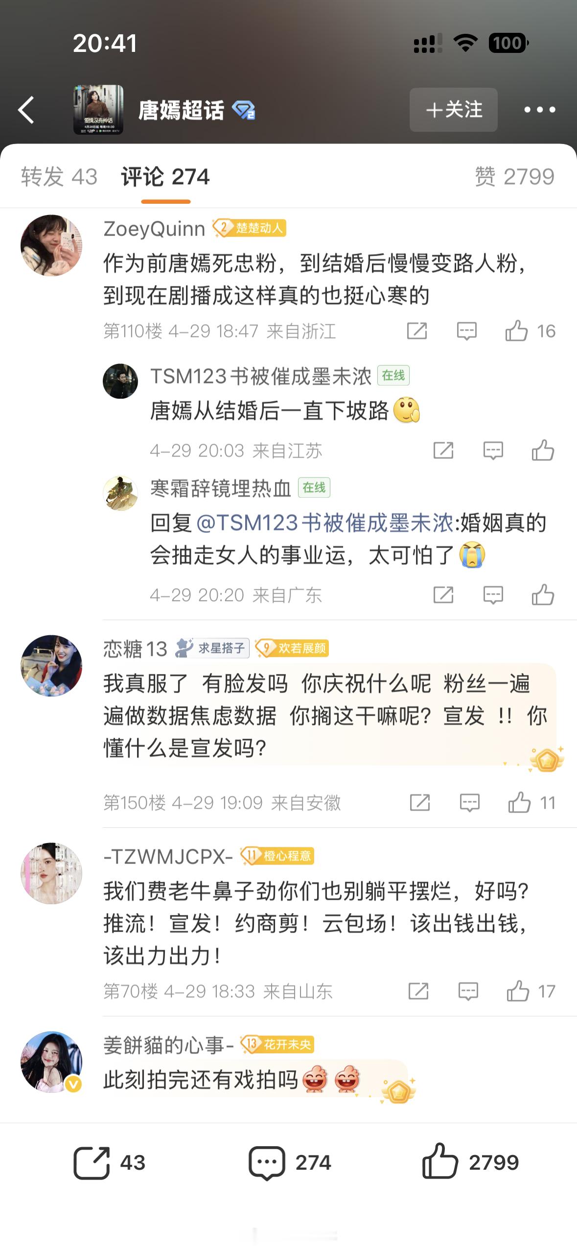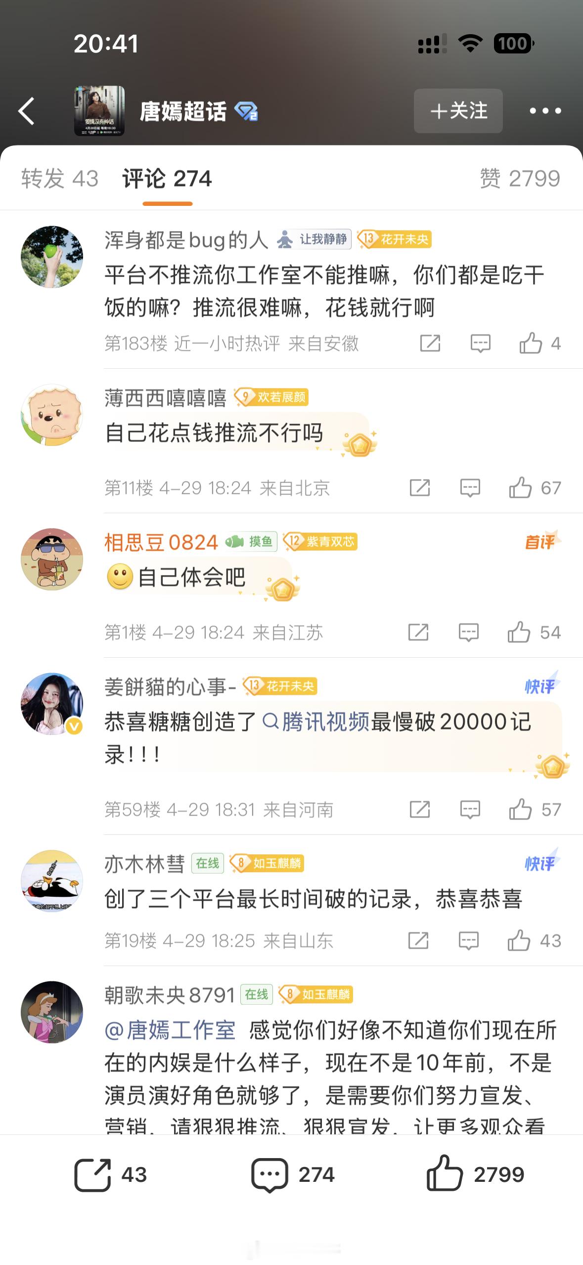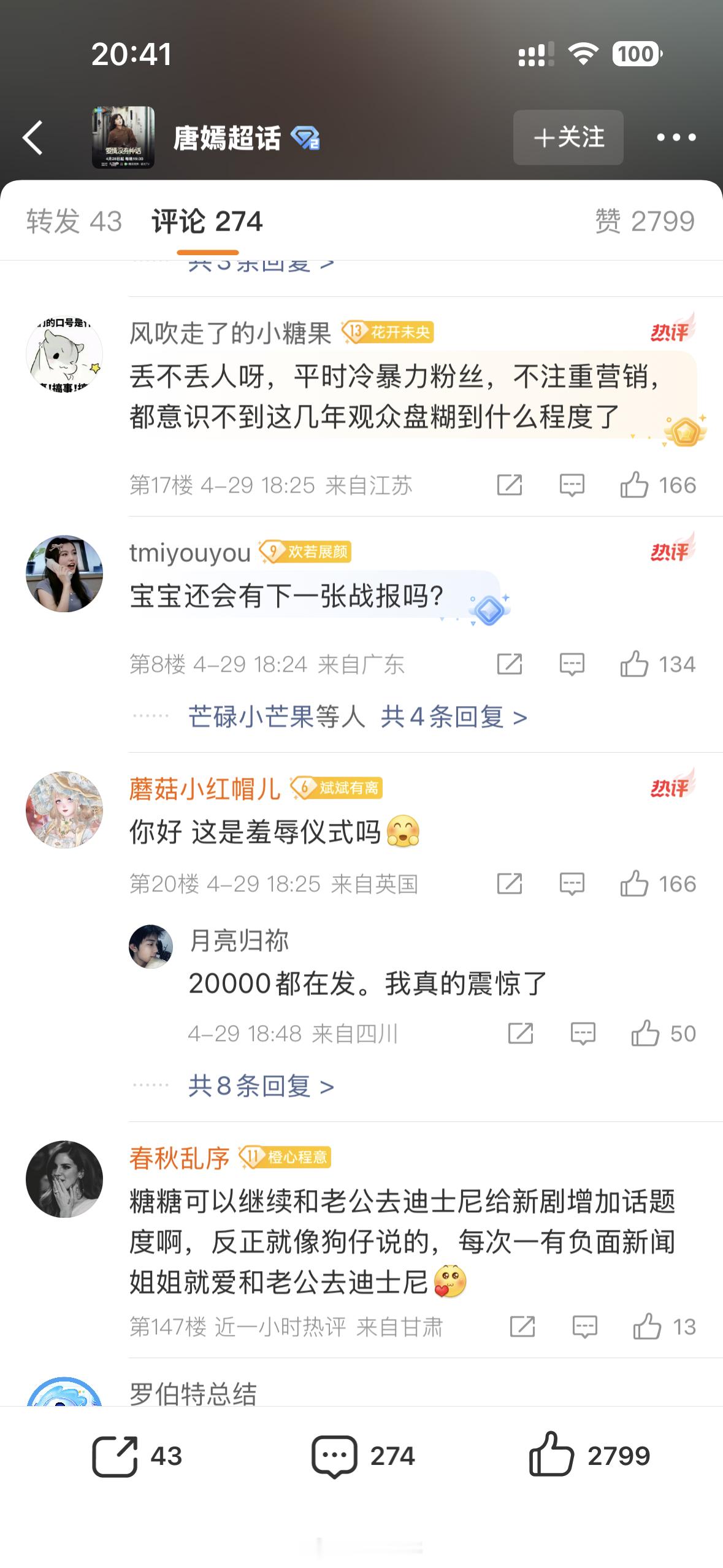 唐嫣主演的《爱情没有神话》破20000热度了,工作室发了战报,评论区粉丝说创下了三平台最长时间破的记录,觉得这是羞辱战报。