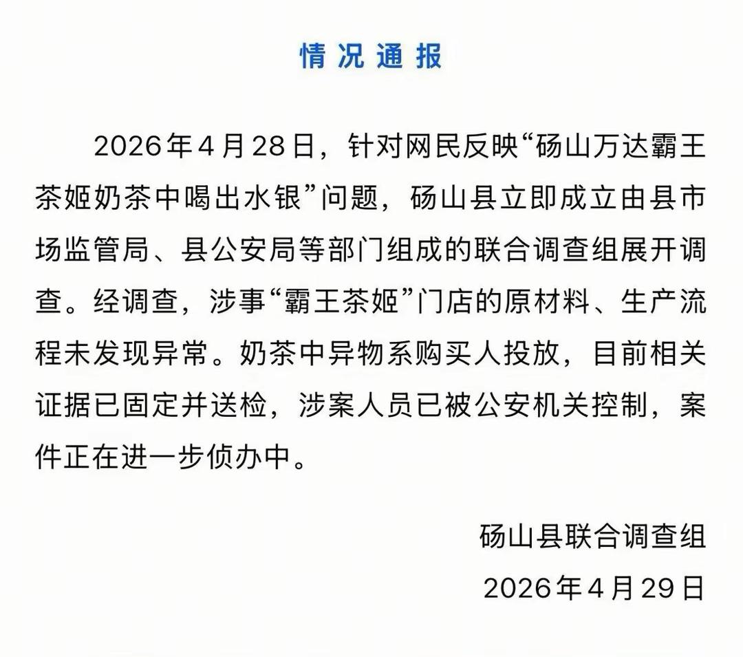 “女子在奶茶中喝出水银”事件真相来了。4月29日,安徽砀山县联合调查组发布情况通报。经调查,涉事“霸王茶姬”门店的原材料、生产流程未发现异常,奶茶中异物系购买人投放。目前相关证据已固定并送检,涉案人员已被公安机关控制,案件正在进一步侦办中。