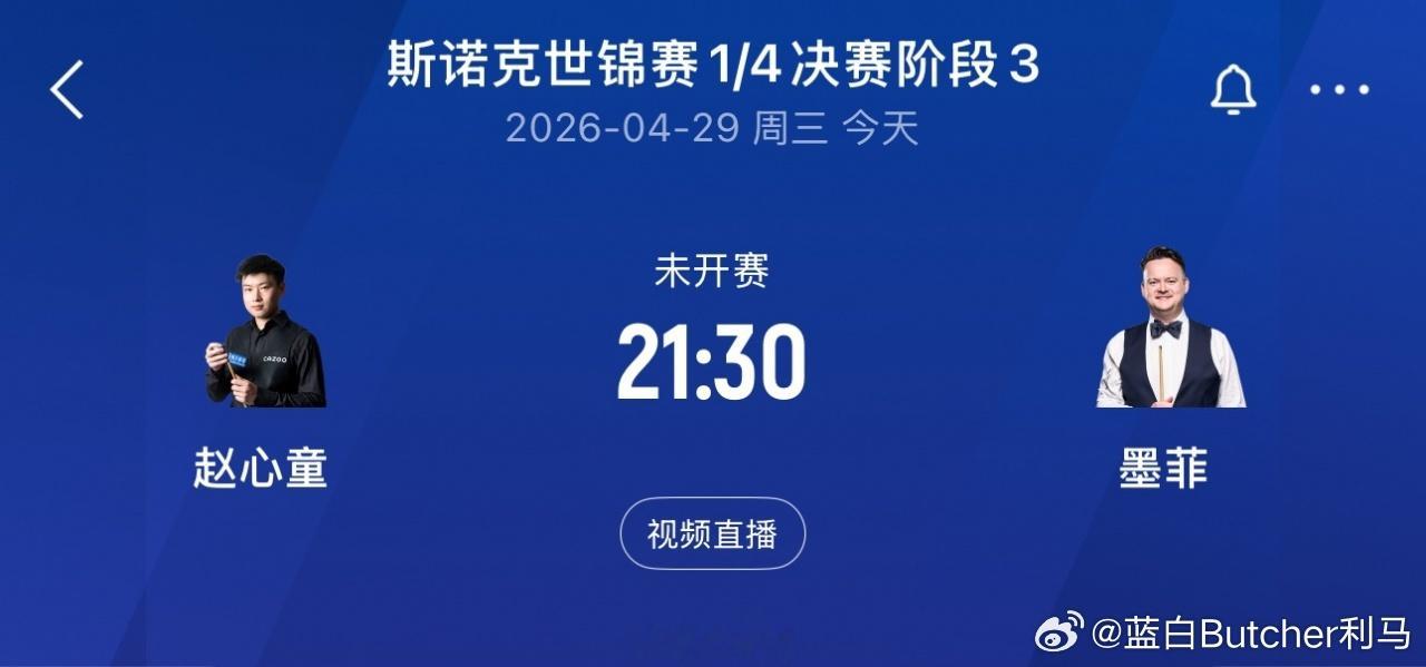 04月29日讯 今晚21:30,斯诺克世锦赛1/4决赛,赵心童与墨菲的阶段3开打,此阶段9局5胜,卫冕冠军赵心童冲击世锦赛半决赛!今晚21:30锁定直播间,吧友们一起来为赵公子加油!