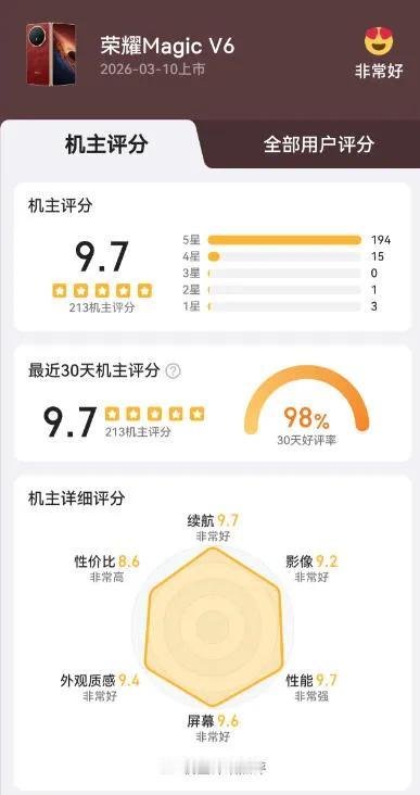 Magic V6直接在酷安杀穿全场,强势登顶总榜第一,还拿下9.8分超高评分,性能榜更是一骑绝尘,屏幕榜、续航榜也稳居前列,这实力简直碾压同级!