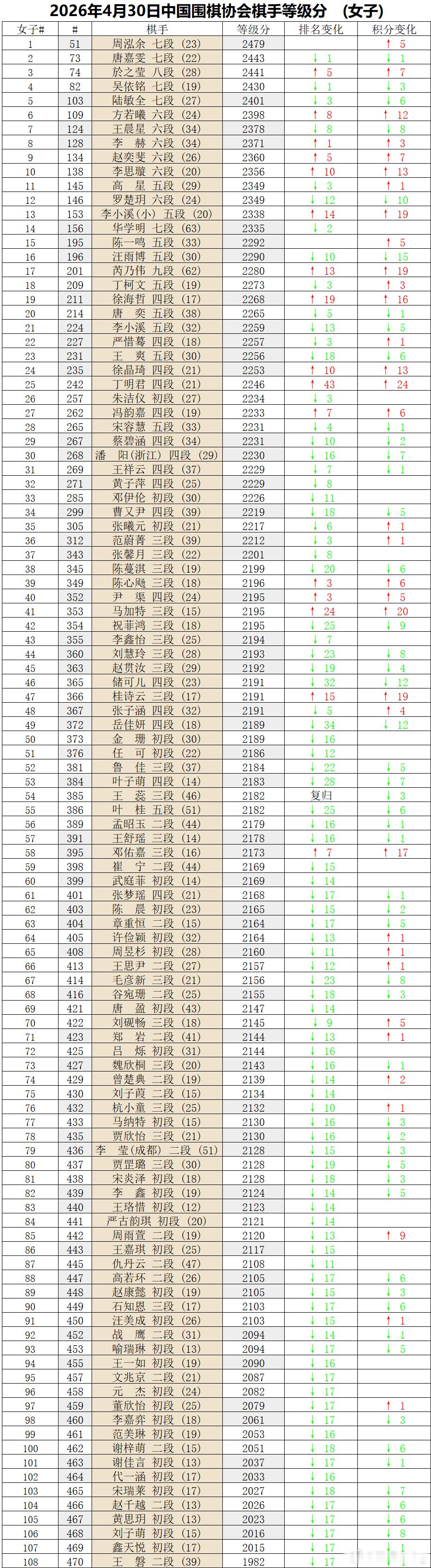 中国围棋职业棋手等级分 2026年4月等级分对局526局,李铭、尹松涛等17名棋手复归,活跃榜棋手470人。等级分排名前十的棋手没有变化,党毅飞在烂柯杯和倡棋杯中取得4胜,李钦诚虽然无缘烂柯杯本赛,但是在倡棋杯取得三胜,两人一同进入倡棋杯半决赛,排名同时上升2位,分别排在第二和第八。王星昊虽然天元卫冕,无奈接连在烂柯杯和倡棋杯失利,本月3胜3负,入不敷出,减少6分下降一名,排在第三。马靖原从烂柯杯赛预选出线,虽然本赛第一轮不敌申真谞,随后又在晋城公开赛连胜两局进入本赛,本月增加27分,是积分增加最多的棋手,排名上升23位,排在第87。此外,刚刚在晋城公开赛中击败林子杰进入本赛的杨皓哲,本月增加26分,仅次于马靖原,排名上升52位,是本月排名上升最多的棋手,排在第256。女子棋手中的丁明君、马加特本月也分别增加24分和20分,排在积分增幅第三、第四,丁明君排名上升43位,上升幅度仅次于杨皓哲,排在第242位。汪雨博遭遇三连败,本月积分减少15分,是积分损失最多的棋手,排名下降10名,排在第196。岳佳妍减少12分,下降34位,是本月排名下降幅度最大的棋手,储可儿同样减少12分,下降32位,陈轶哲虽只减少7分,同样下降32位。活跃女子棋手108人,於之莹、陆敏全在晋城公开赛最后一轮意外失手,未能进入本赛,等级分也未能更进一步,依然排在女子第三、第五,陆敏全也未能挤进前百。於之莹也是在烂柯杯预选决胜局失利之后,再次在预选决胜局败北。吴依铭不敌丁明君,未能缩小与女子前三的差距。方若曦增加12分,上升8位,确保了自己女子第六的位置,同时也为自己晋升七段,成为中国女子围棋第十二名上手增添了更多的砝码。小将马加特虽然在女子国手赛、晋城公开赛中有着战胜王爽、李赫等高段女子棋手的佳绩,但是对于冲击女子顶尖层面的棋手还存在不小的差距,未来可期,任重道远。活跃榜中共有86名新秀棋手,他们的年龄是男子18岁以下,女子20岁以下,其中男子48人,女子38人。邱禹然、段博尧依然领衔新秀榜,排在前两位,他们也同时进入等级分榜前五十,排在第41和第42,积分相差1分。段博尧还可以在榜上坚持一年,邱禹然还有半年时间将退出新秀榜单。女子新秀方面吴依铭仍然遥遥领先,不过等到她退出新秀榜的时候,在新秀前十名里面还会不会有女子棋手,有的话将会是谁,是一个很好的题目,徐海哲如果不再加一把努力,成为下一个女子新秀榜首的时候,也许在全部新秀榜上还是徘徊在十名之外。(注:本表仅供参考,具体以围棋协会公布为准)
