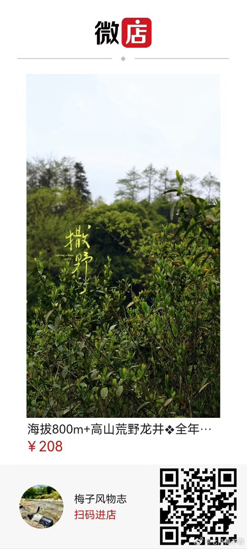 如果喝茶也看脸的话,那这款茶绝不在选择之列,群体种本身就是一个族群,所以芽叶参差不齐,加上野放环境,茶叶生长更是肆意,做出来的干茶自然大小颜色都不匀整,枯瘦苍劲像个历经风霜的老人。但温杯摇香的刹那,它的香气是极具冲击力的浓郁,等到干茶经过沸水的洗礼,这种浓郁丰富又分解成具体的兰香、山林的山野气息以及甜鲜感一一向你展开,小伙伴用“凝练”来形容这种风味,颇觉贴切,像春日山野的香气被浓缩成一团投进茶汤,在味蕾上迸发,可以说是最有筋骨的一款龙井茶。。这种风味离不开野放的生长环境,无人工干预,完全自然生长,能长到一人多高,且生长周期长,全年只采摘一次,茶树休养生息时间长,内含物质积累丰富。荒野、野放(无人工干预)的另一面就是“稀少”,产量极低,特殊年份也会出现颗粒无收的情况,所以并不是每年都能喝到,在今年天气不乐观的情况下能喝到是一份幸运的馈赠。热闹的春茶季过后,茶山回归寂静,茶树开始另一轮的生发和积累。雨前龙井帷幕看似已经缓缓落下,荒野龙井的最佳的品饮期才刚刚开始,这第一口鲜到此刻才真正落在口感上而非时间上。此款某宝售卖价格6000-17700元/斤,小卖部今年也能做出不到10斤,便结束了。手慢无…七月梅子青