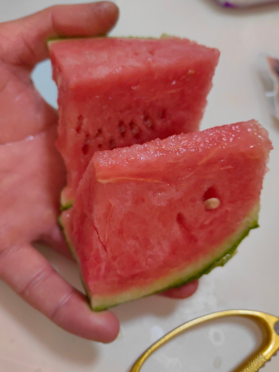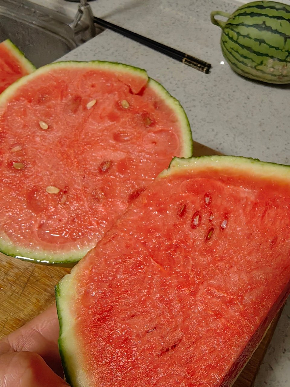 一看就甜丝丝,红红的沙瓤,卖相直逼满分 ,这款西瓜优点多多皮薄汁水多、糖度高、果肉细腻吃过的都被俘获了!要比脆的话,别的瓜切下去是扎扎实实的这个小西瓜,脆度是不多见的 “沾刀裂”小瓜的有点就是皮薄,吃起来没有压力,随开随吃,不怕吃不完浪费,脆甜脆甜的小瓜简直就是追剧伴侣~砀山小糖丸西瓜