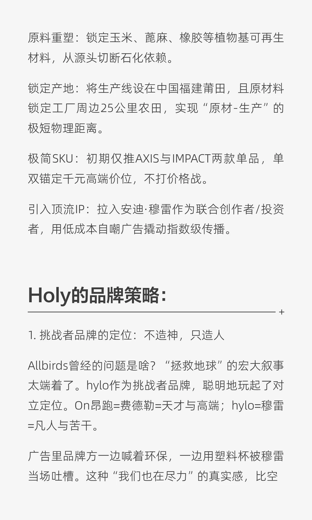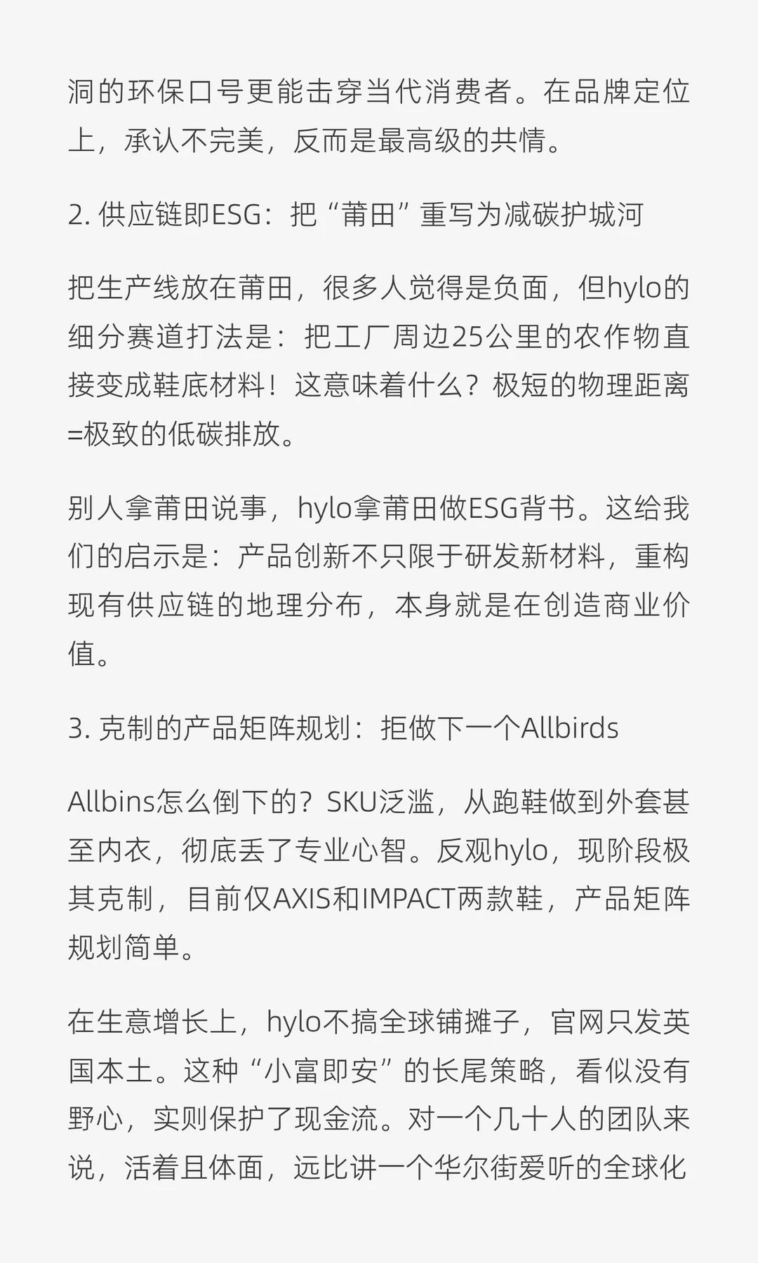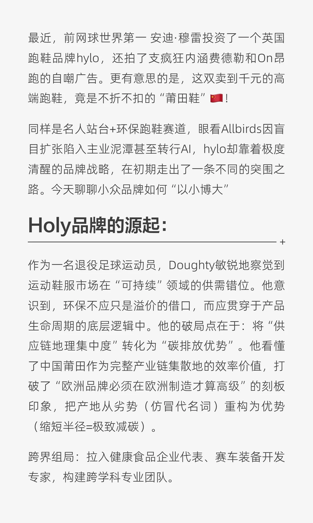 安迪·穆雷投资的英国跑鞋品牌hylo,通过中国莆田的供应链实现环保与成本优化,推出高端植物基跑鞋。品牌强调极简产品线和真实环保叙事,避免全球扩张,保持现金流,成功突围。