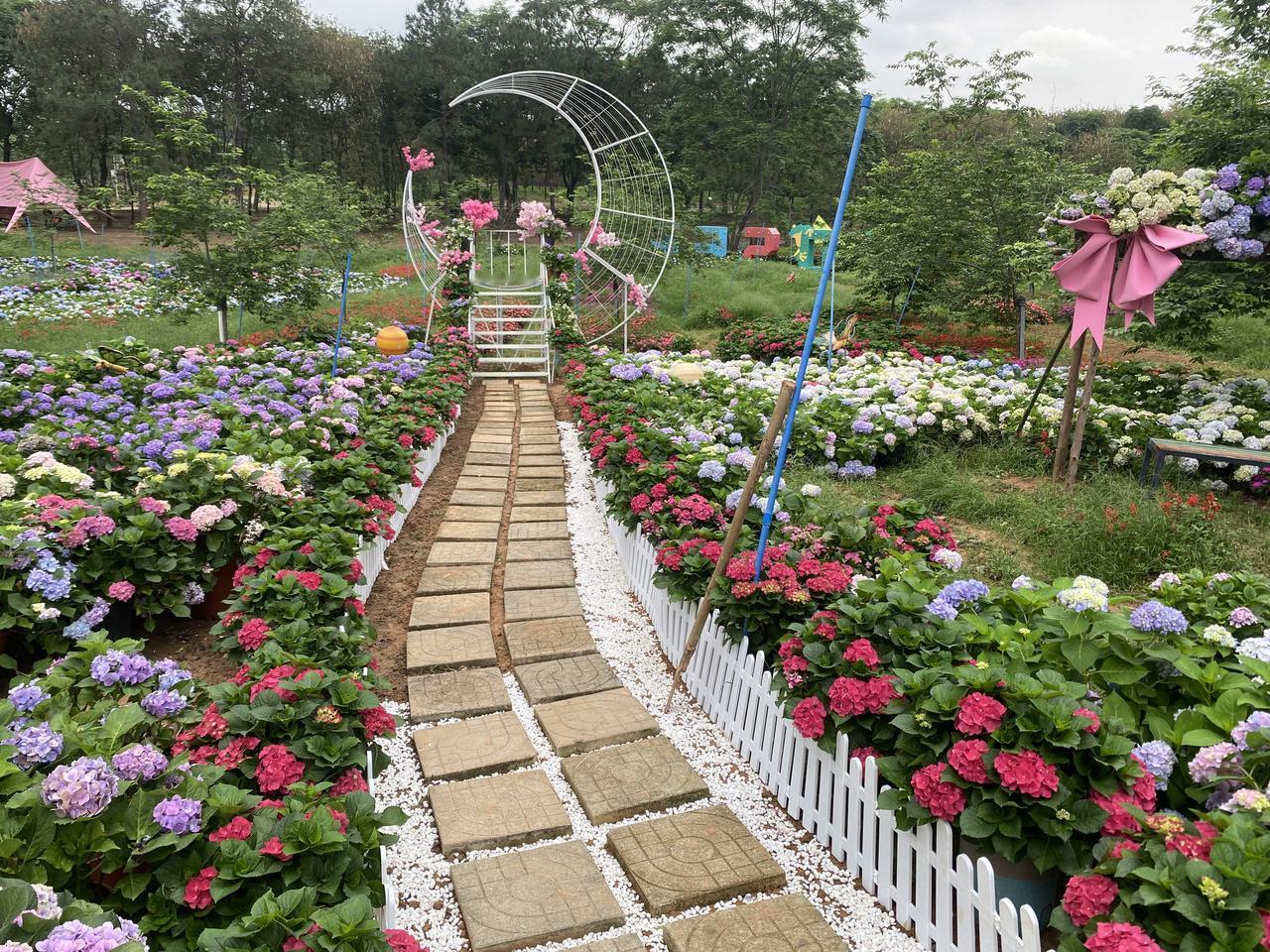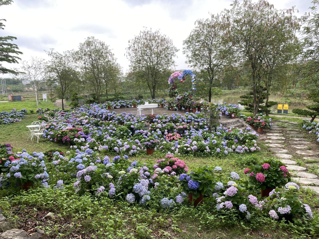 市区自驾1小时直达,三四月份过来,樱花季刚过,但园区里大片绣球花正开得热闹。淡蓝、粉紫、奶白的绣球花连成一片,层层叠叠的花团饱满又治愈,搭配园区的欧式小建筑,随手一拍都是清新感大片,出片率直接拉满📸