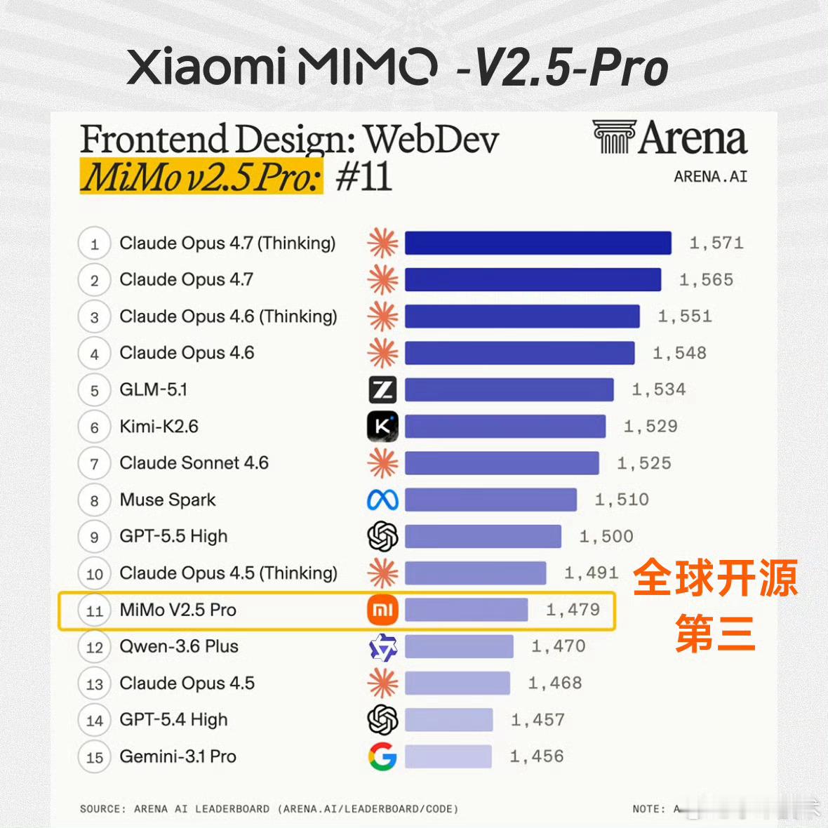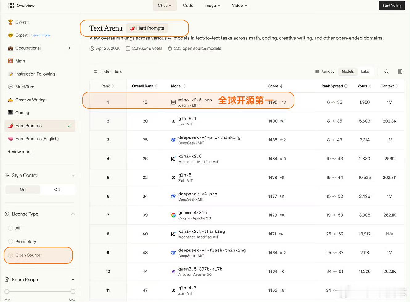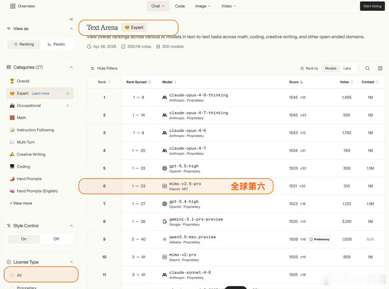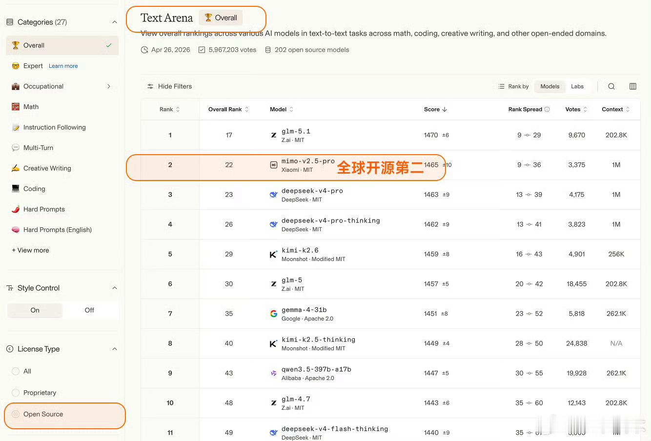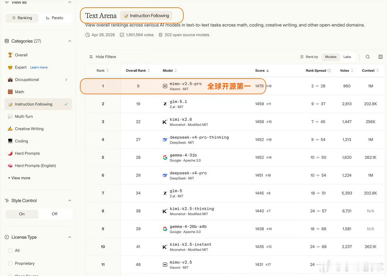 Arena评测的核心机制是「双盲测试」——所有模型身份完全隐藏,由全球真实用户基于回答质量即时投票,从底层逻辑上规避了传统评测里“针对特定数据集调优刷榜”的问题,是目前行业里公认的、最能反映大模型真实对话与解决问题能力的标尺之一。这次更新里,MiMo-V2.5-Pro在Text Arena Expert榜单上拿到了全球第六的排名,这也是整个榜单里排名第一的开源模型、同时也是排名最高的国产模型。更值得关注的是实验室维度的排名,小米以大模型研发主体的身份,排在全球第三,仅次于Anthropic和OpenAI,是目前唯一挤入这个顶级梯队的非美系、非闭源玩家。除了Expert硬核榜单,MiMo在其他维度的表现同样能打:覆盖数学、编程、创意写作等综合文本任务的Overall榜单里,位列全球开源模型第二;考察真实前端代码生成能力的Code Arena WebDev榜单,跻身全球开源前三;而在困难任务、英文困难任务、指令遵循、长文任务这四个关键子维度,更是全部拿下了全球开源模型第一的成绩,底层能力没有明显短板。这个成绩的含金量远不止几个排名数字。开源模型要在这种盲测机制里跑赢,难度远高于闭源模型——闭源模型可以无上限堆算力、针对场景定向调优,而开源模型需要在性能、可部署性、泛化能力之间做平衡,还要在用户完全不知道模型身份的情况下,靠硬实力赢过闭源巨头,本质上是小米技术路线连续性的一次验证,也给国产开源AI的发展路线打了样。