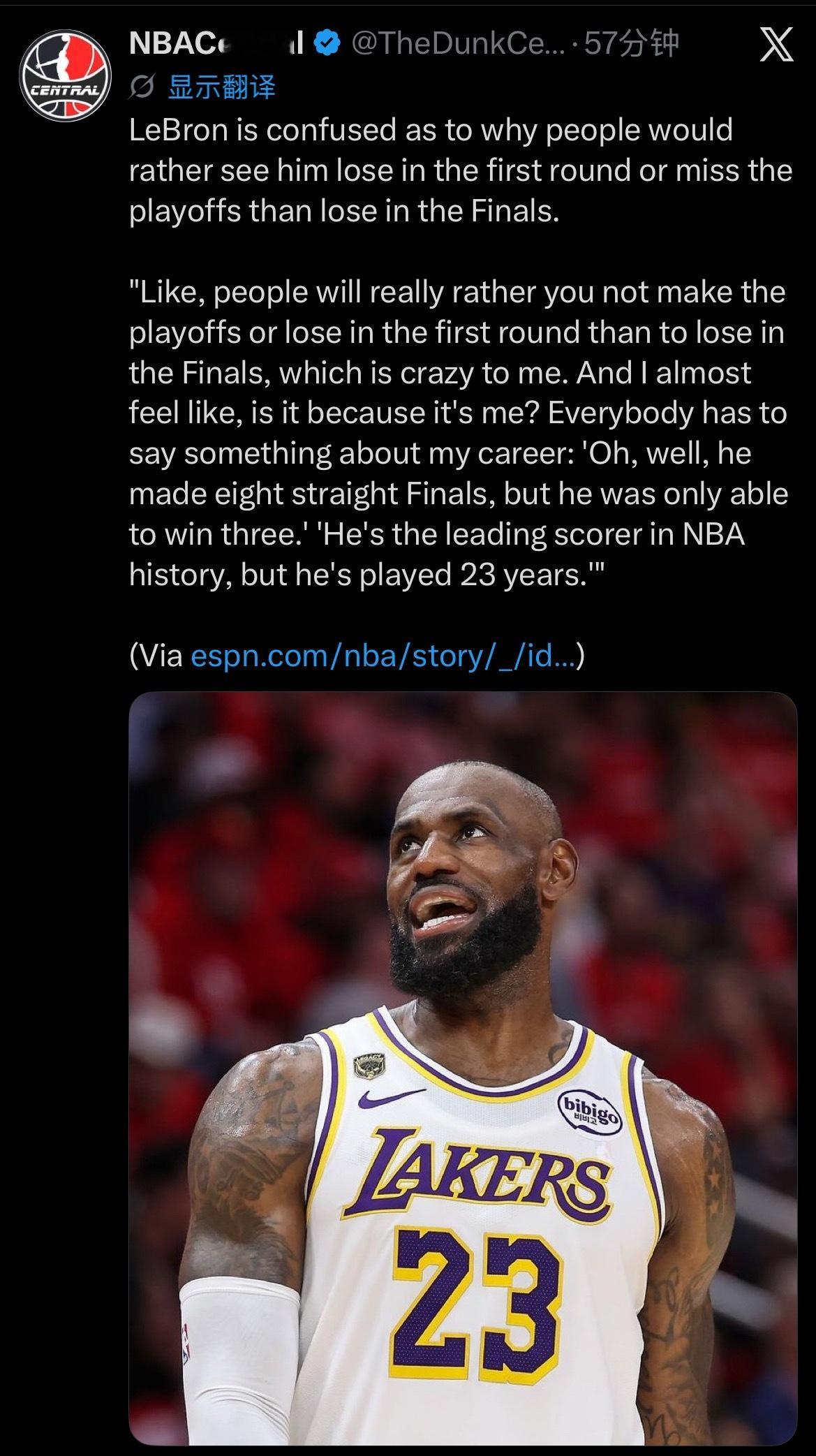 “说实话,人们真的宁愿我进不了季后赛,或是首轮就出局,也接受不了我折戟总决赛,这让我觉得太荒谬了。