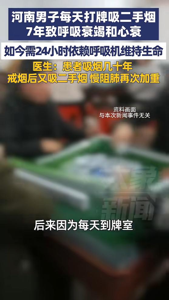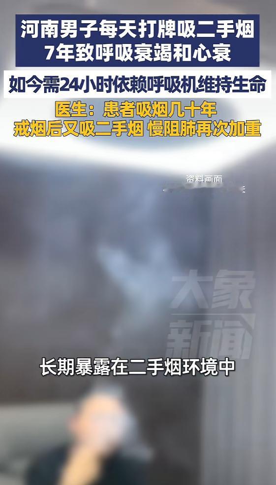 信息来源:《河南男子每天打牌吸二手烟7年,致呼吸衰竭和心衰,如今需24小时依赖呼吸机维持生命,医生:患者吸烟几十年,戒烟后又吸二手烟,慢阻肺再次加重》大象新闻