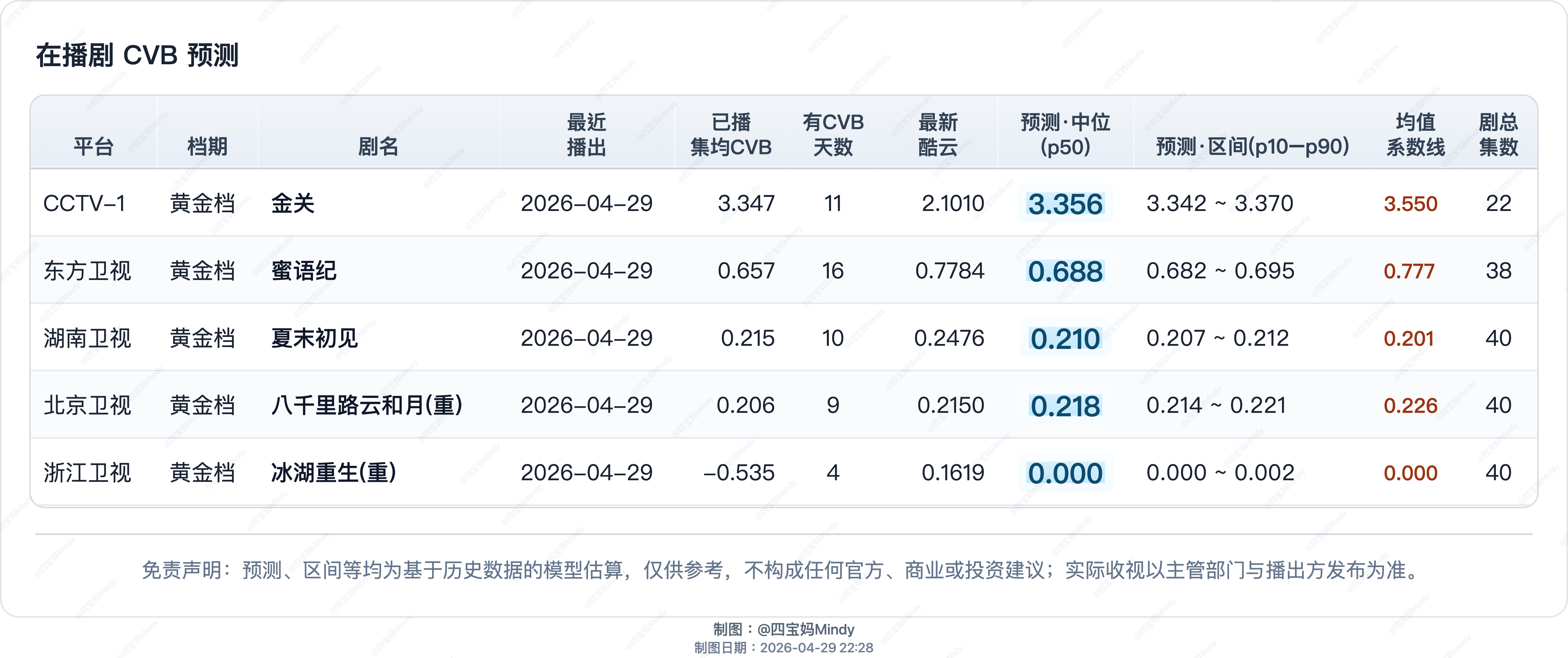 4.29 CVB预测在播剧:金关、爱情没有神话、蜜语纪、冰湖重生 、夏末初见