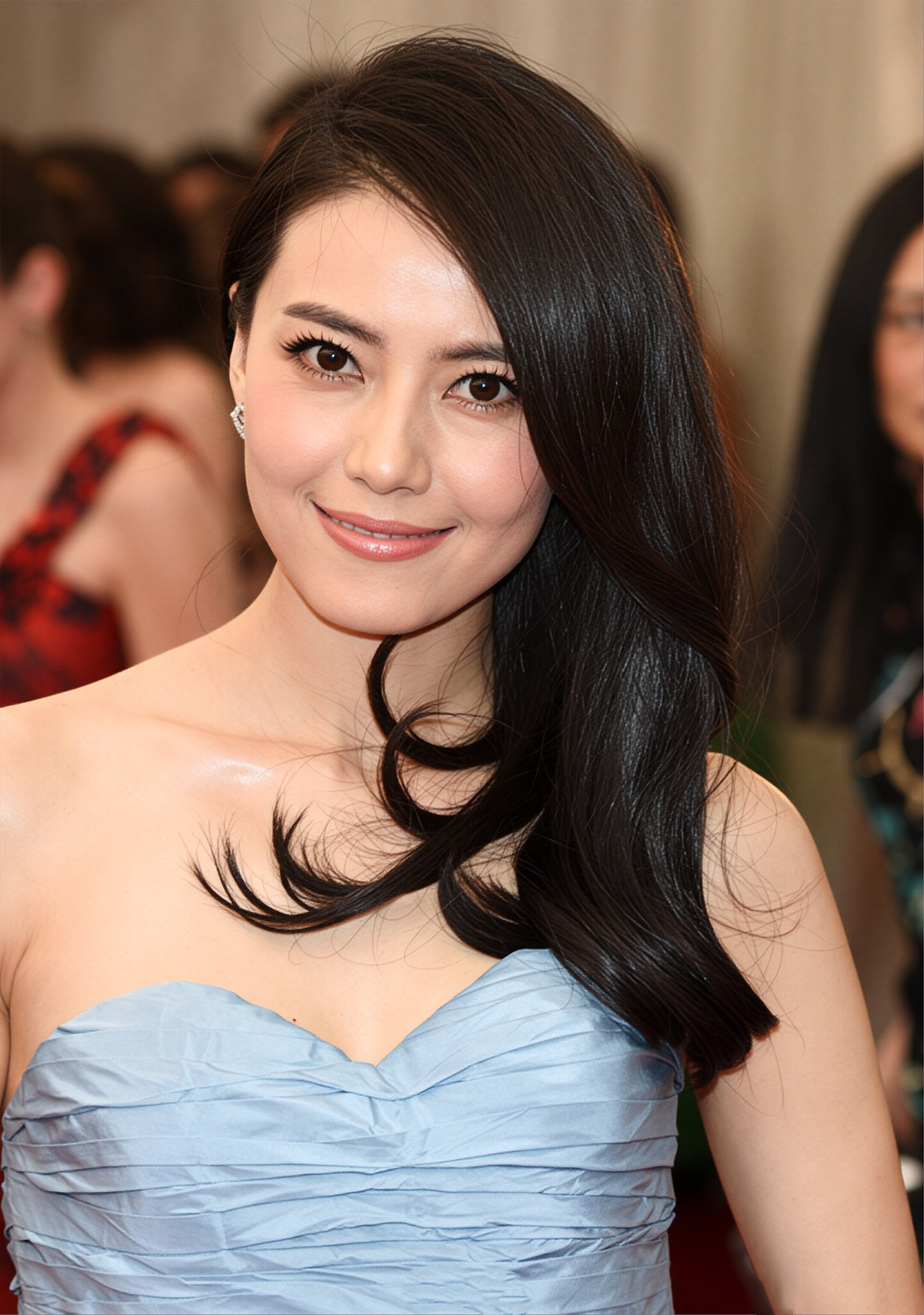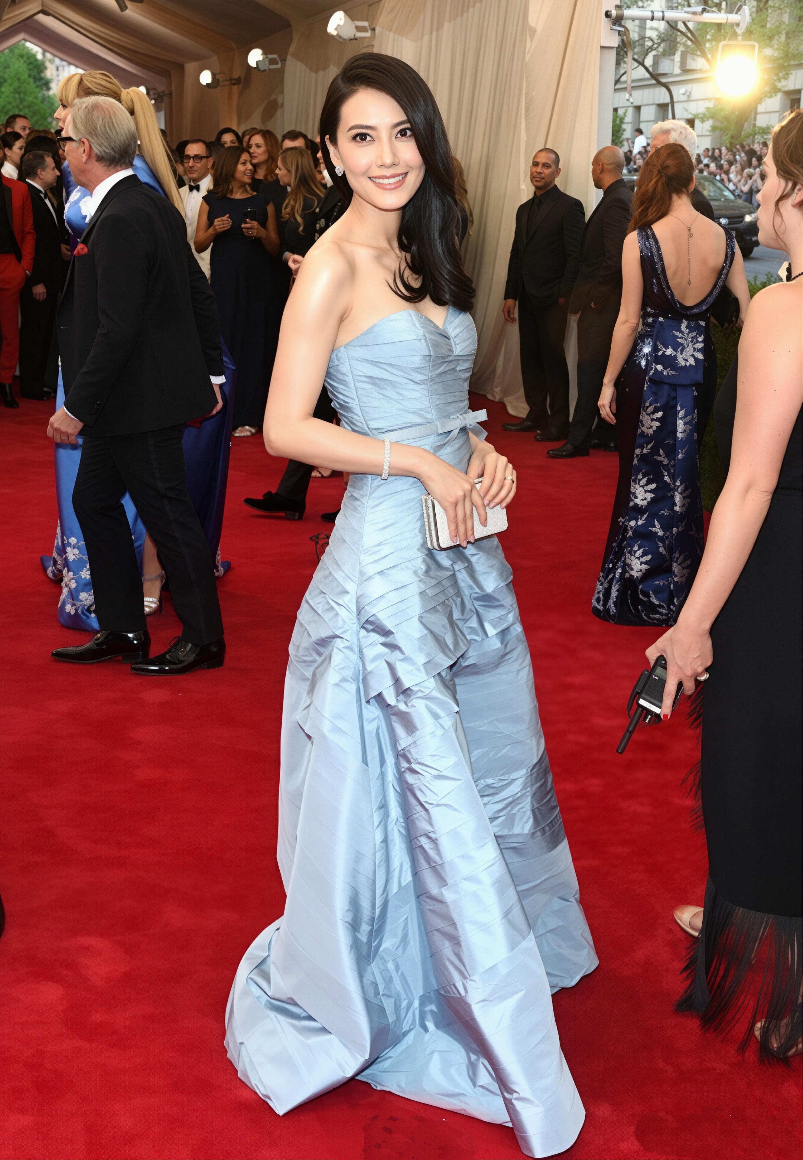浅蓝缎面褶皱裙衬得她肩颈线条又直又美,利落剪裁勾勒出优雅轮廓,又带着几分少女的清甜灵动。搭配微卷黑长直与清透钻石配饰,整个人像从童话里走出来的冰蓝公主,温柔又贵气,生图状态美得毫不费力。