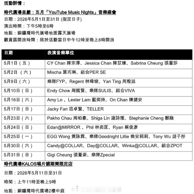 国际大都会香港 「蔡俊彦 等逾30組歌手雲集..时代广场 11場免費音乐会 5月開鑼 … 大公文匯全媒體報道,香港铜锣湾时代广场 將於今年5月在露天廣場呈獻共11場YouTube Music Nights 現場音樂演出。是次企劃邀請了逾30組本地歌手及音樂單位參與,包括樂壇新人Ryan蔡俊彥、周柏豪 、CY Chan陳宗澤 、、陈健安 、Edan 及Zpecial 等,為大眾帶來涵蓋多種音樂風格的現場演唱及特別合作舞台。活動免費開放,公眾無需預先登記即可親臨參與。除現場音樂演出外,香港铜锣湾 時代廣場亦將多元化的音樂體驗延伸至商場各處。由5月起,時代廣場大電視及鐘樓將定期展出YouTube 每周排行榜「本周熱播歌曲」;本地積木品牌KALOS亦會於商場內開設「唱片舖」主題期間限定店,為大眾提供結合本地音樂與創意元素的豐富體驗..」入內看全文:网页链接 即时娱乐新闻 娱乐圈 电影 电视 音乐 乐坛 ..… 香港