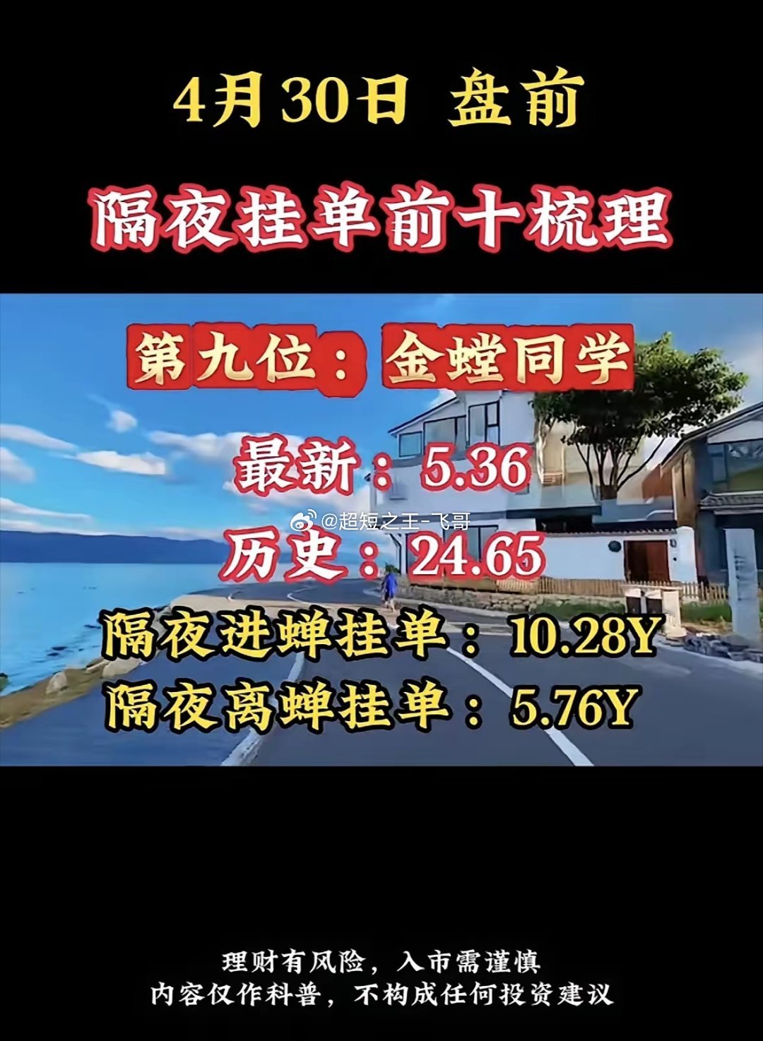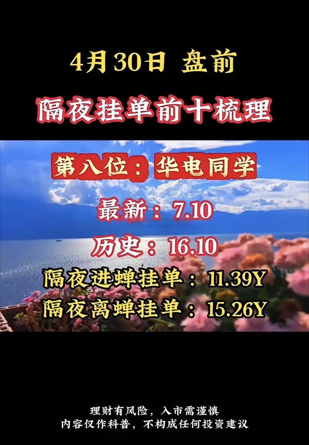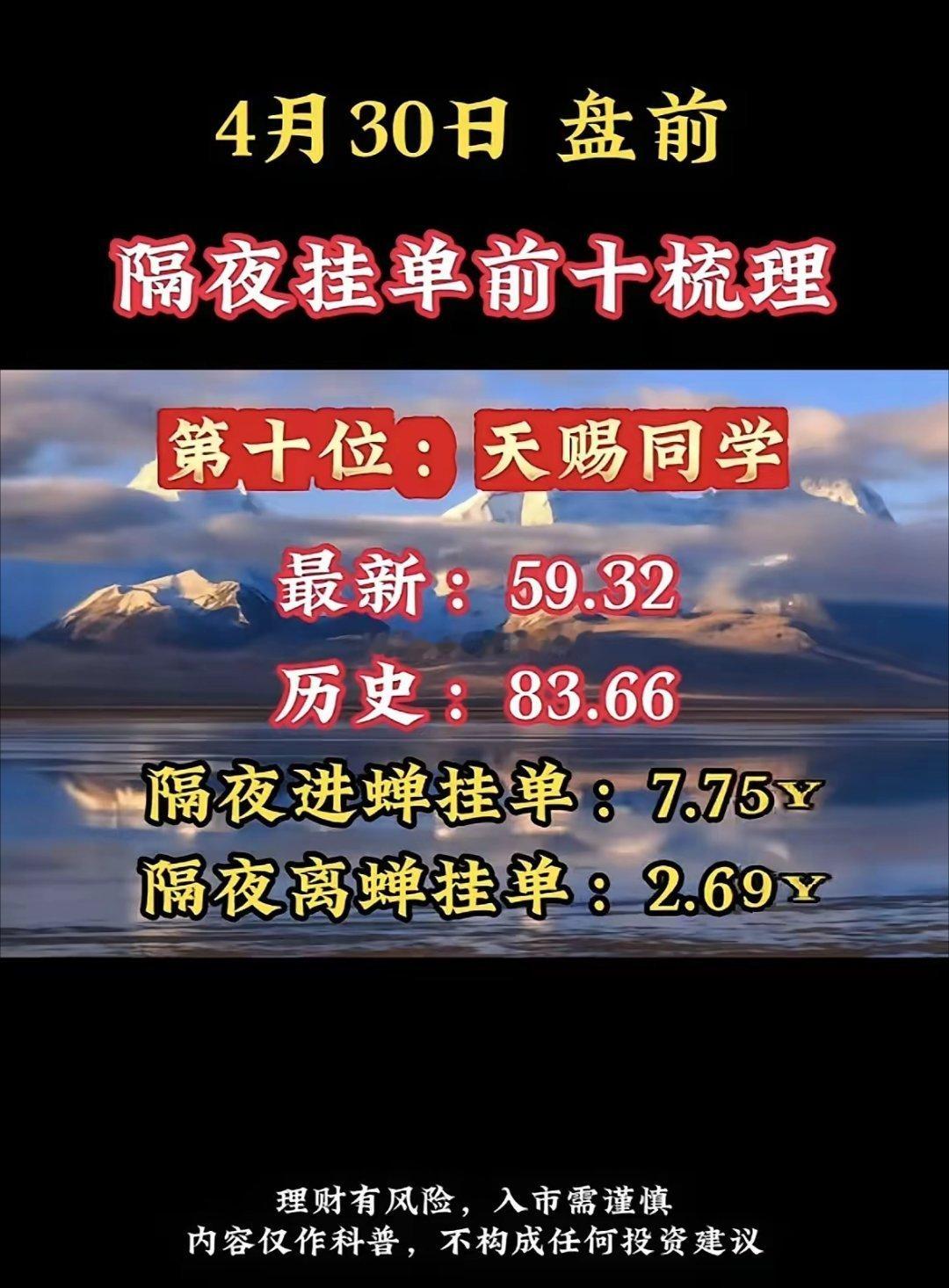 4月30日周四暗盘隔夜挂单排行榜揭晓投资圈里,“天赐同学”隔夜挂单前十大梳理得关注起来,投资风险那可是得谨慎再谨慎。就拿4月29日暗盘隔夜挂单TOP6来说,华电辽能挂单69.20亿排第一,它沾上绿色电力、风电、智能电网热门赛道,踩中能源转型风口,资金自然疯抢。华电能源挂单46.71亿排第二,绿色电力、一季报增长和煤炭的组合很妙,业绩有支撑,符合“稳增长+长趋势”。圣阳股份挂单79.80亿排第三,液冷、储能、算力这些当下顶流概念集于一身,不被资金青睐才怪。不过隔夜挂单也有门道,得搞清楚挂单时间、有效期限等,不然容易白忙活,投资这事儿,还真得步步小心。