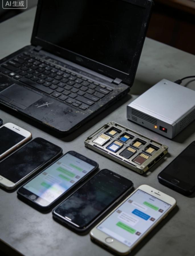 被缴获的设备有:电脑、手机、多卡器、服务器等,均为典型的电诈工具。