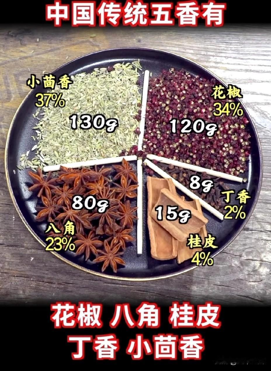 材料:五香粉30克、八角5个、桂皮1小块、香叶3片、花椒15克。