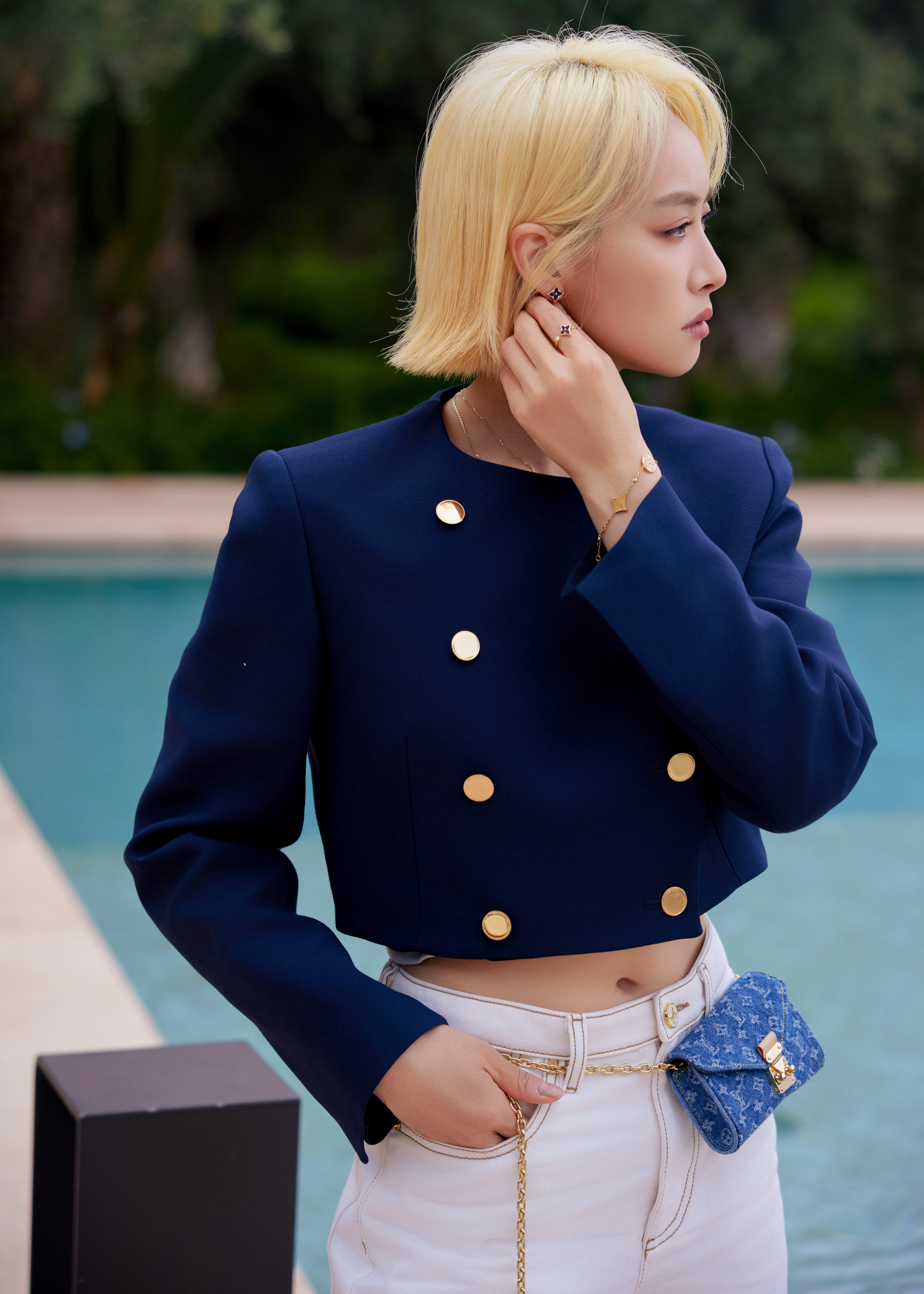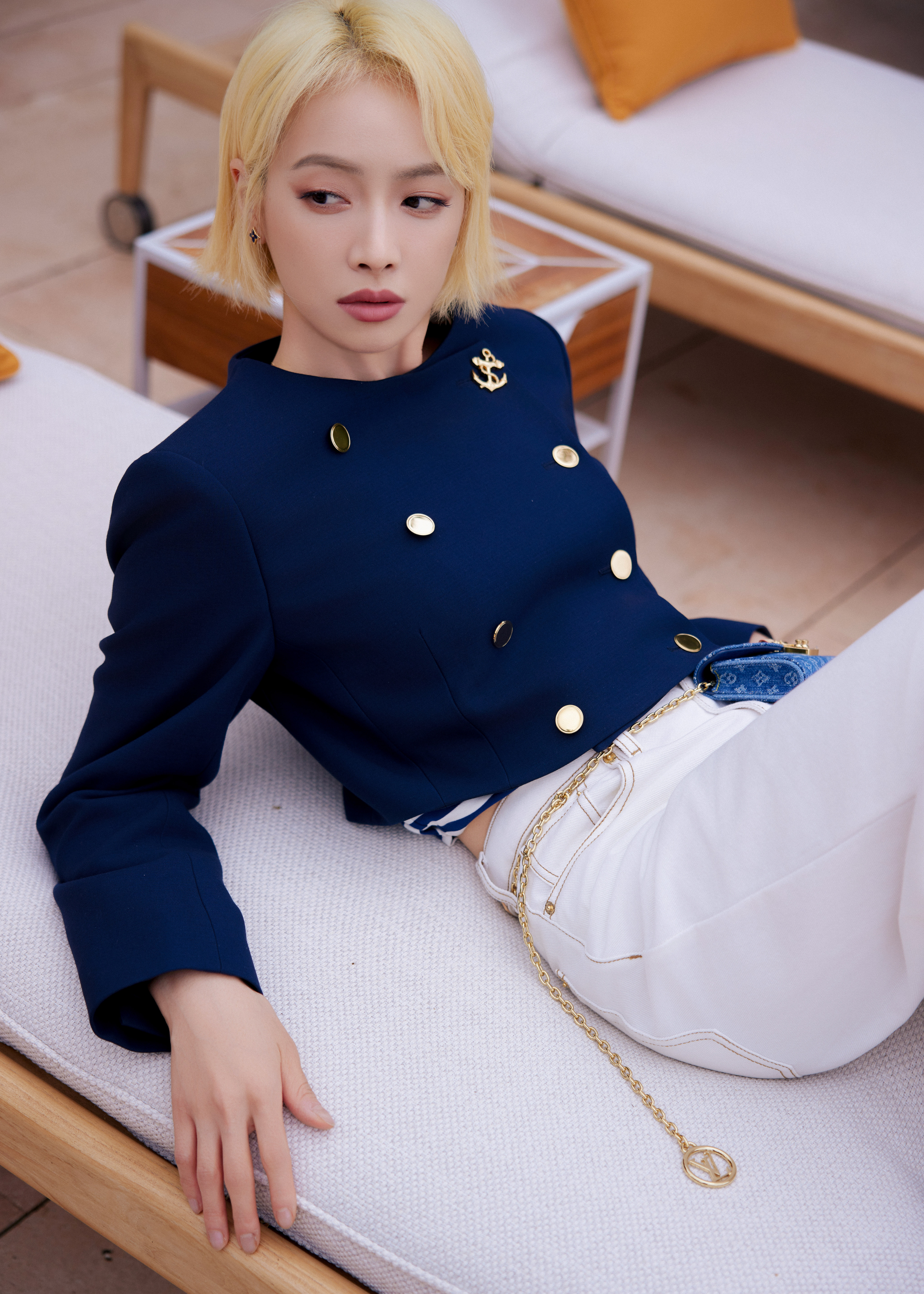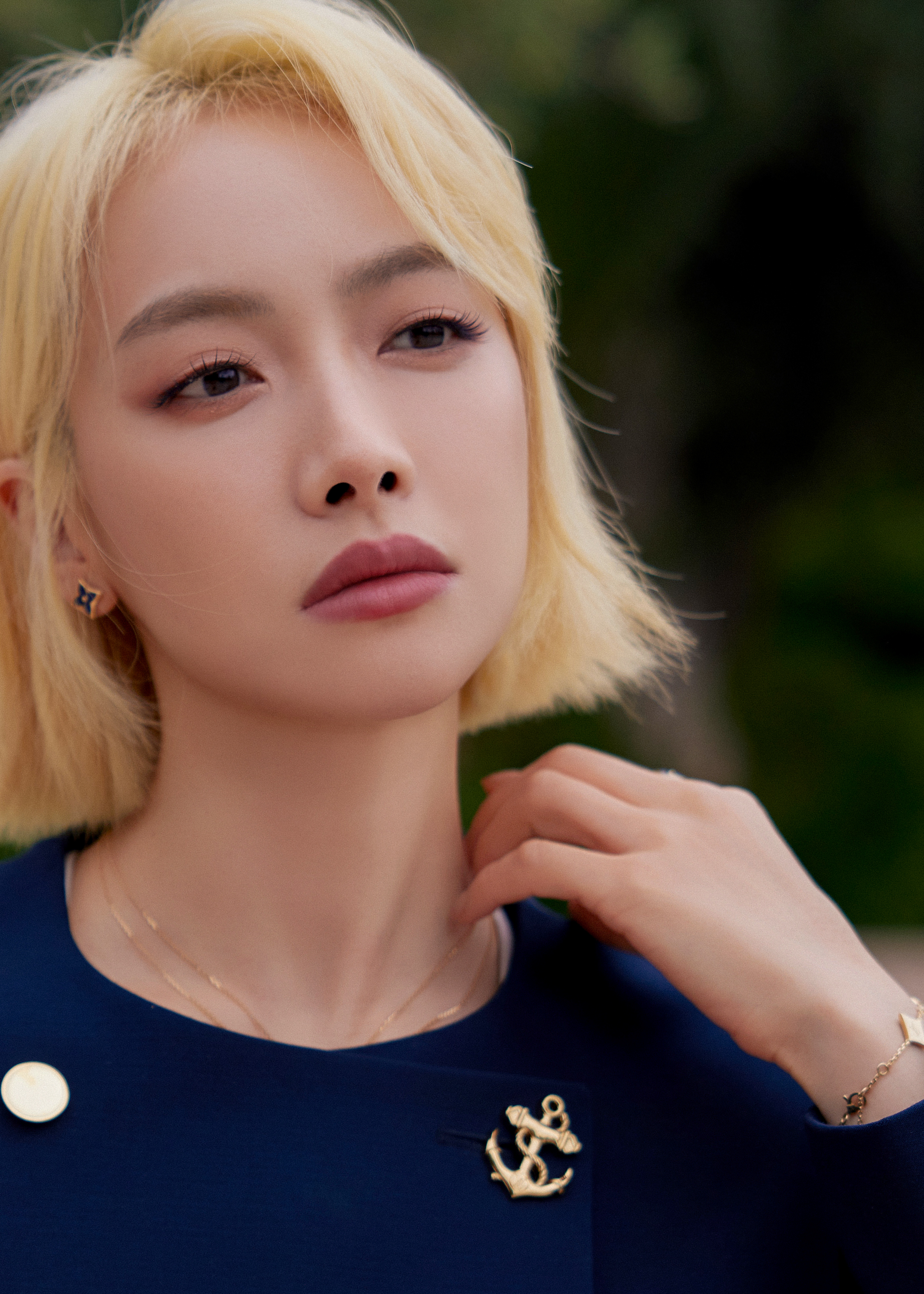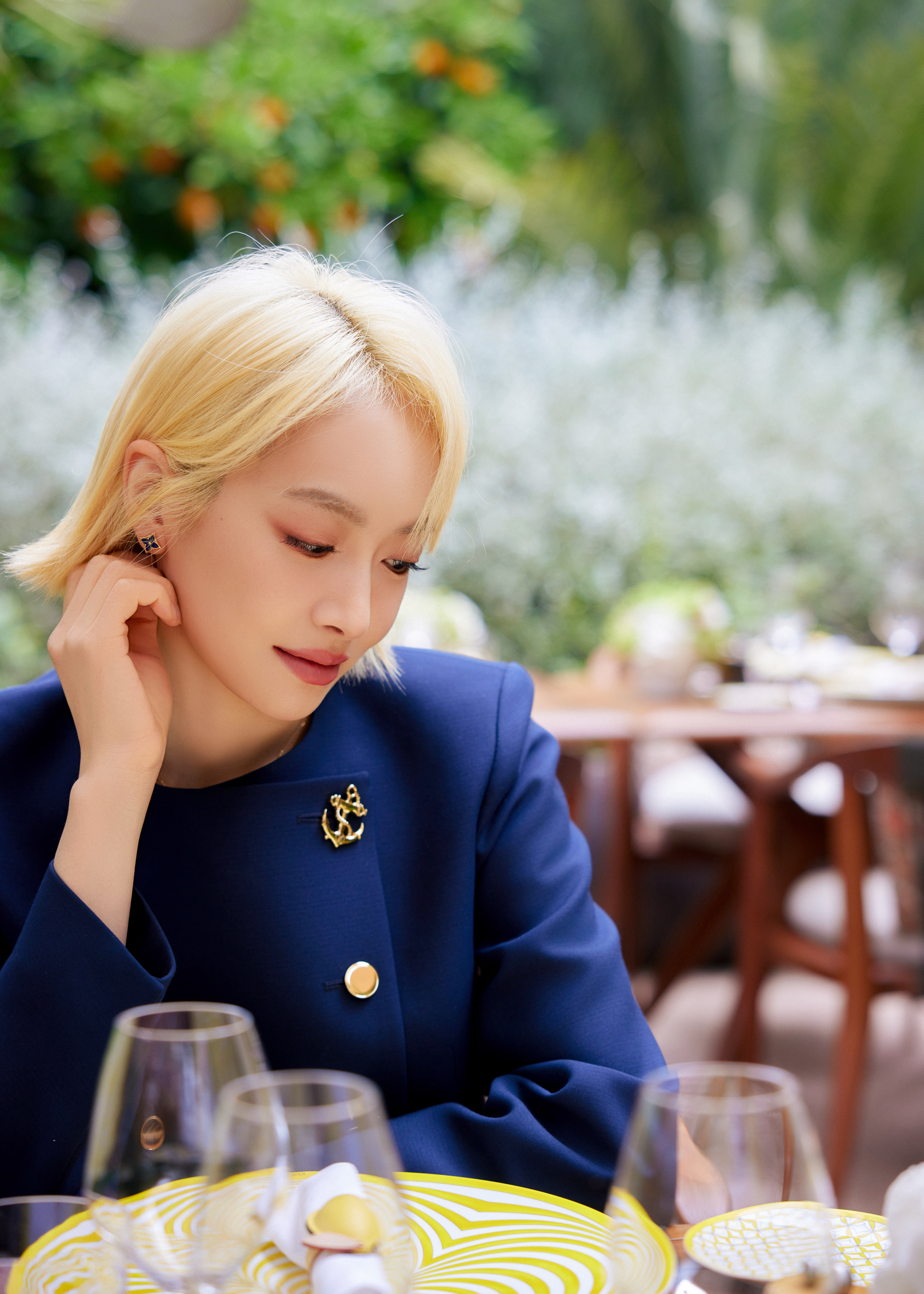 宋茜 明暗相契,质感交融,金蓝缀以灵韵。清隽利落之间,矜贵气场分寸自显。