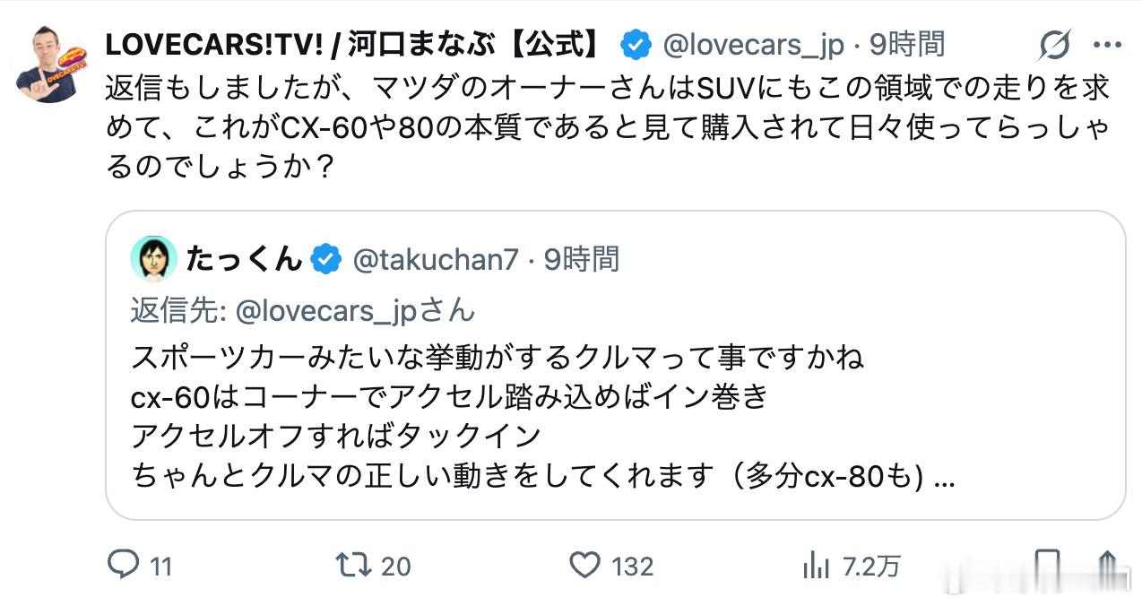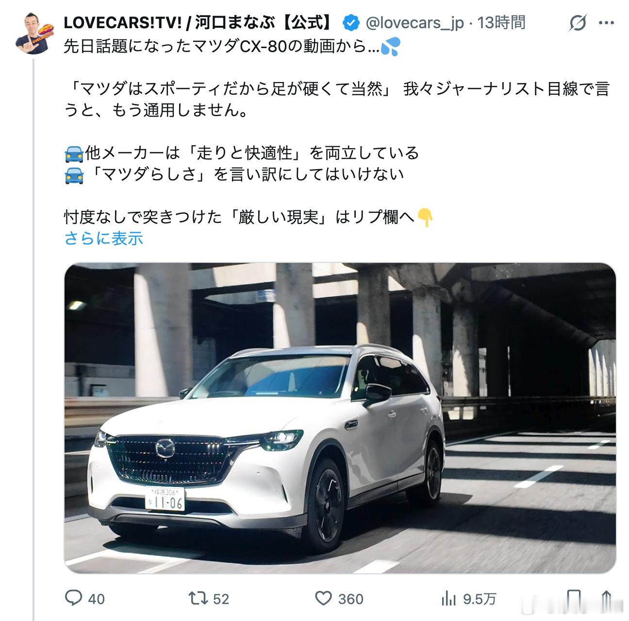 日本车评人河口学聊CX-80动态的帖子还有后续。转天,河口发帖说有网友在视频下评论,“马自达调校运动,底盘硬是当然的”。