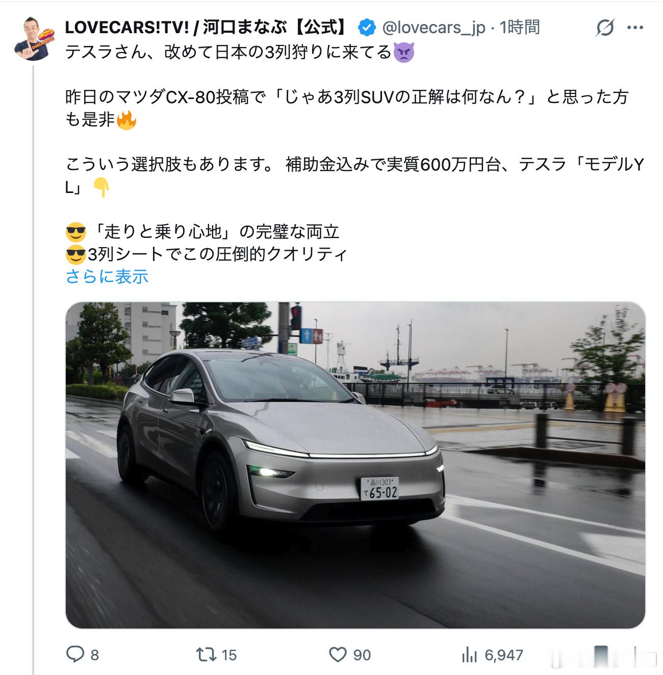 今天,河口学拿出了“驾驶和舒适性平衡很好”的例子,特斯拉Model YL。