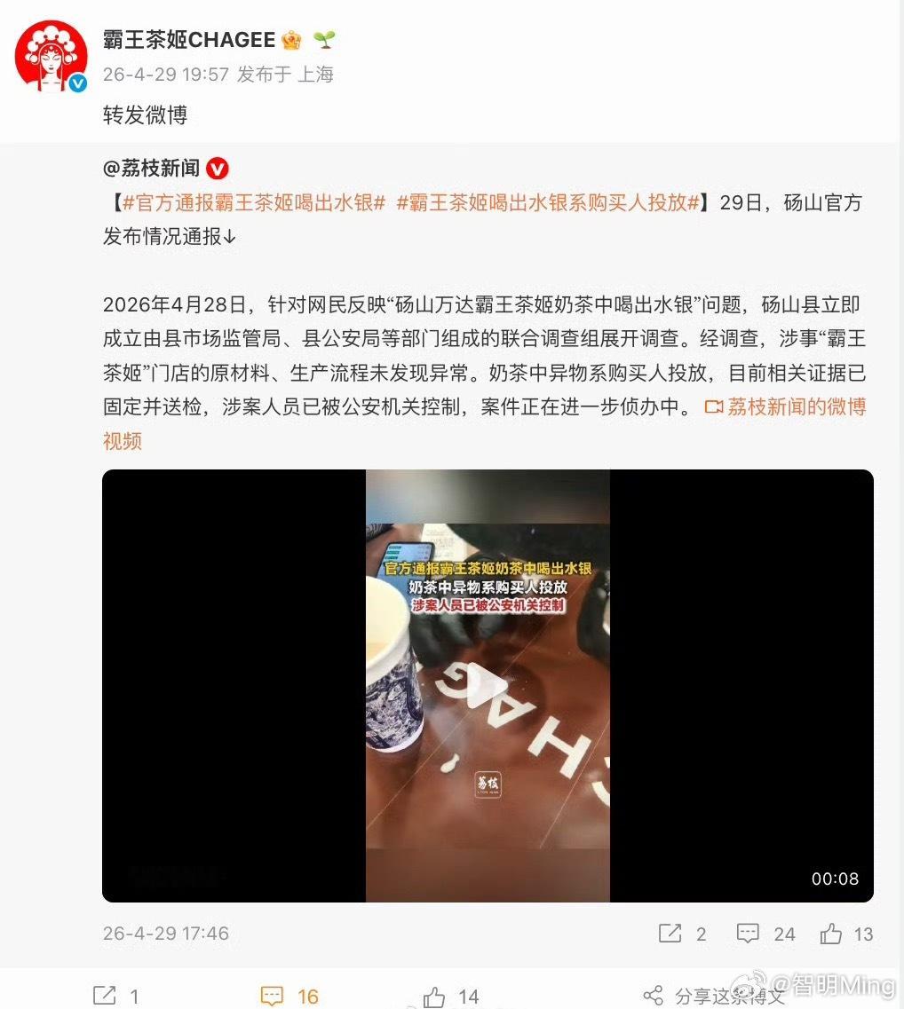 霸王茶姬奶茶中喝出水银调查结果霸王茶姬异物事件的通报结果,已经出来了。通报称,异物系购买人投放,目前购买人已被公安机关控制。