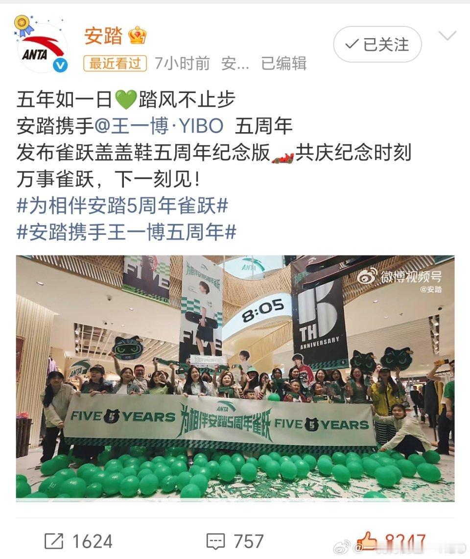 王一博×安踏 合作五周年,共赴荣光! 五年前,王一博因立.场坚定主动解//约,安踏第一时间携手,以信任与诚意并肩同行。五载相伴,王一博稳居内娱顶流,始终以专业与热爱传递正能量;安踏从国货领军迈向全球巨头,稳居中国运动品牌第一、全球前三,多品牌矩阵与全球化布局持续领跑。 从初心坚守到行业标杆,从国民信赖到世界瞩目,彼此成就、双向奔赴!为相伴安踏5周年雀跃安踏携手王一博五周年