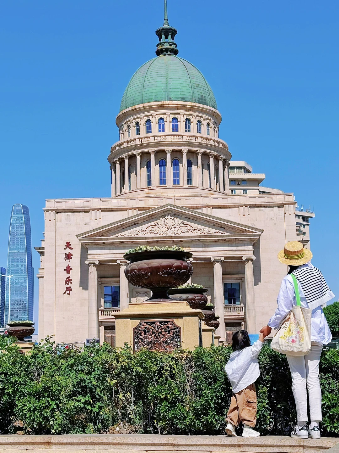 ✅天津音乐厅:白色欧式建筑,绿色穹顶很好拍!花坛处可避开人群拍照