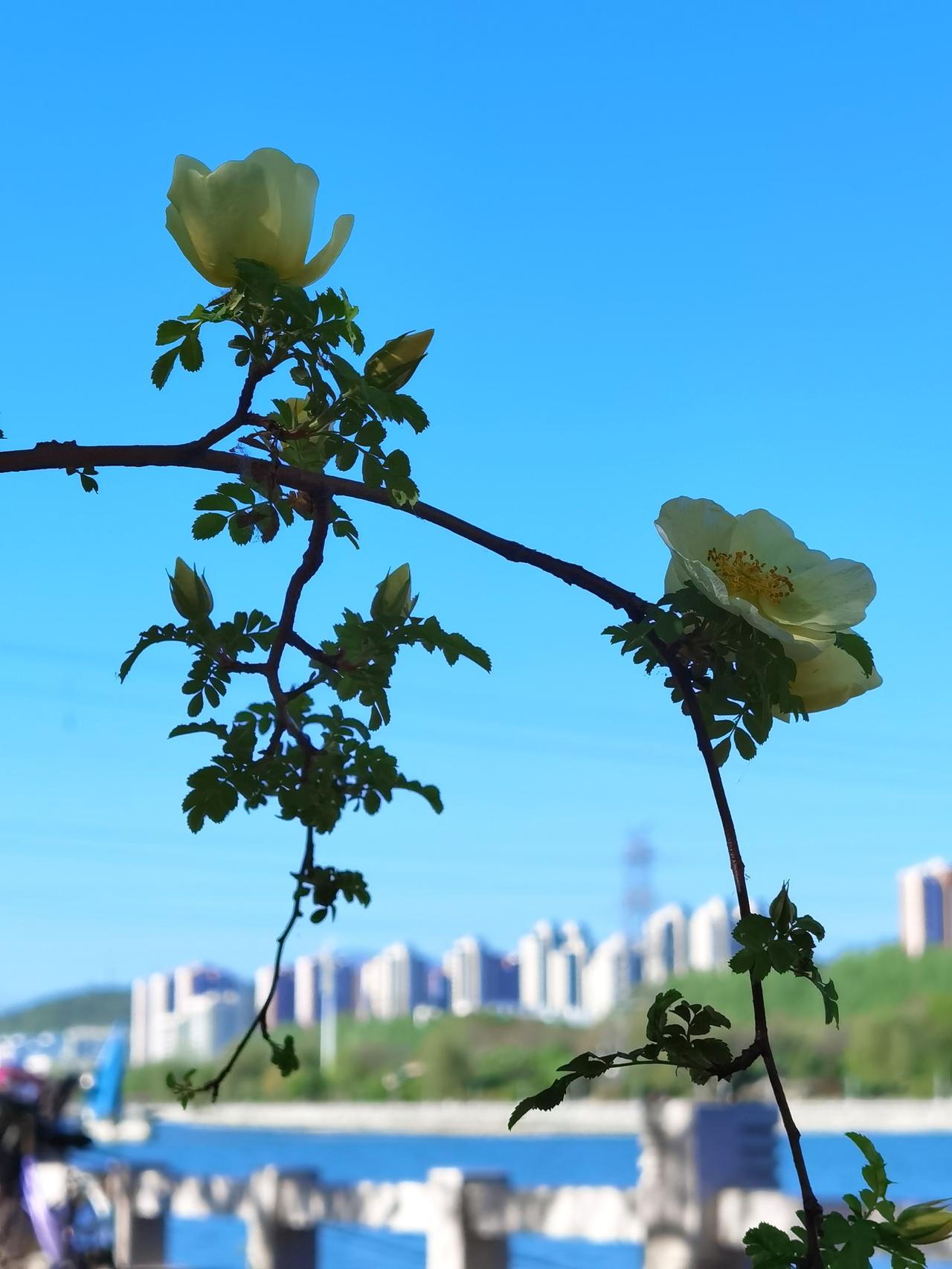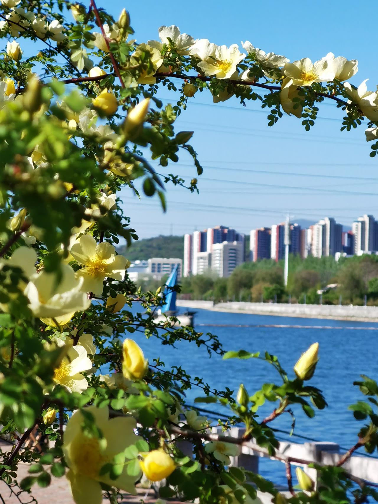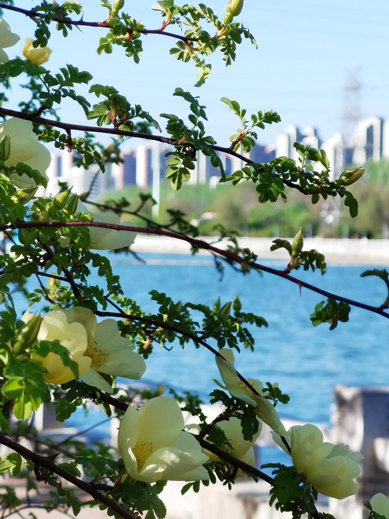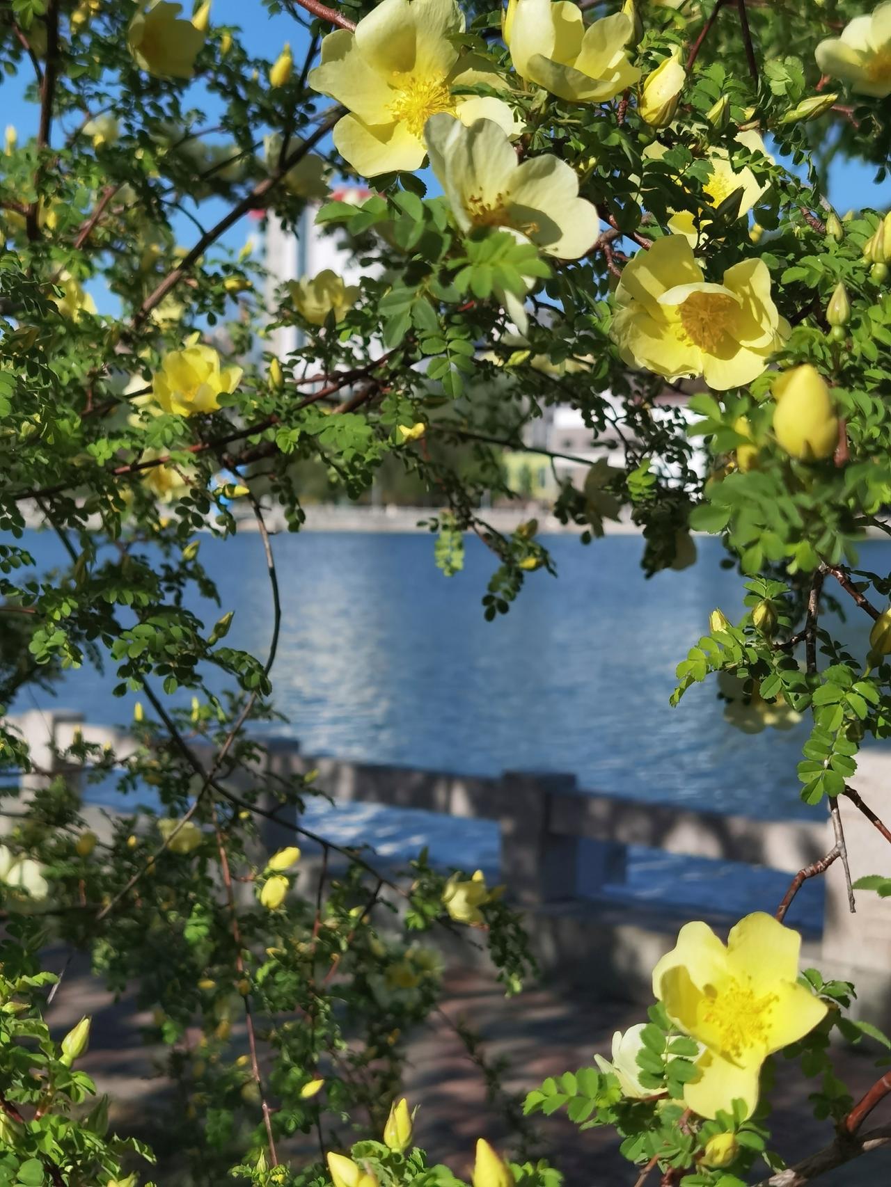 承德武烈河畔是欣赏春花的好地方。从三月底的杏花开始,陆陆续续的迎春、山桃、榆叶梅、梨花、海棠等竞相开放,临近五一,春花也接近尾声了。不过,这几天黄刺玫正在盛开,迎宾路规划展览馆对面的武烈河畔的十几株正在开花,这可能真的是最后一波春花了。