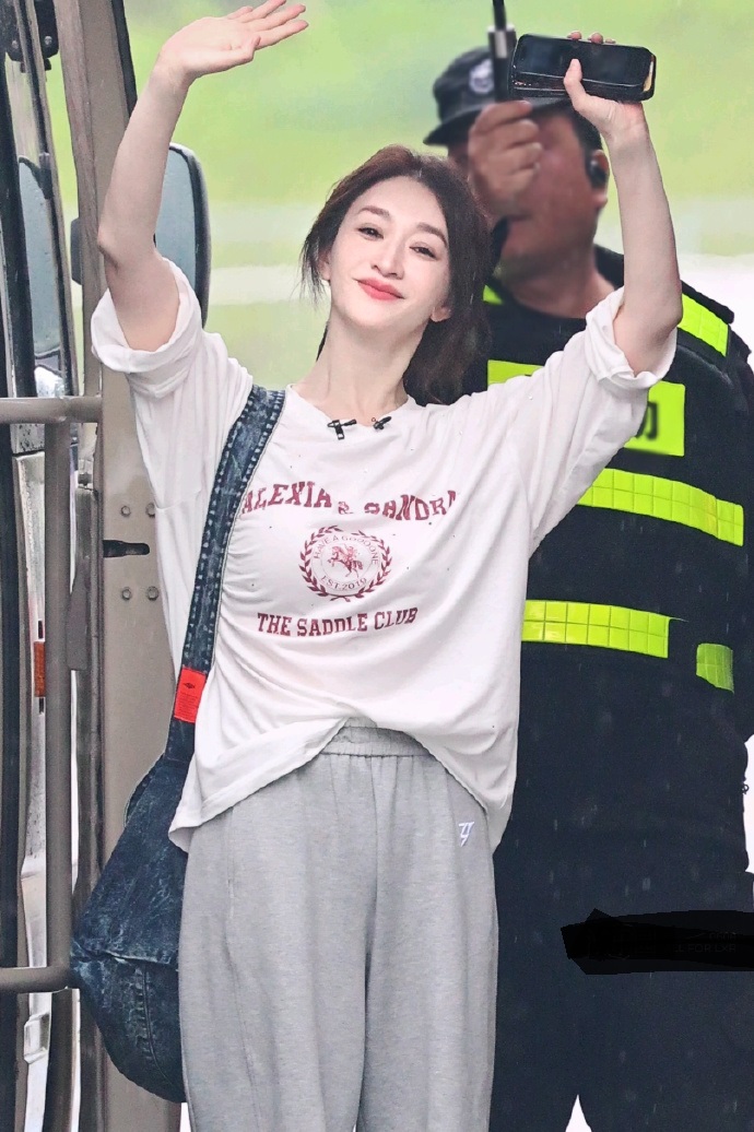 李小冉上身穿白色字母风T恤,下身搭配灰色运动裤,整个人显得格外的有动感之美。