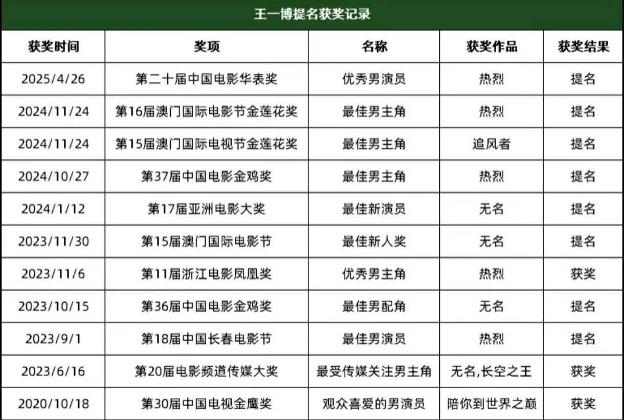 2025年王一博再次凭《热烈》获得华表奖优秀男演员提名,且是90后首位华表奖影帝提名。