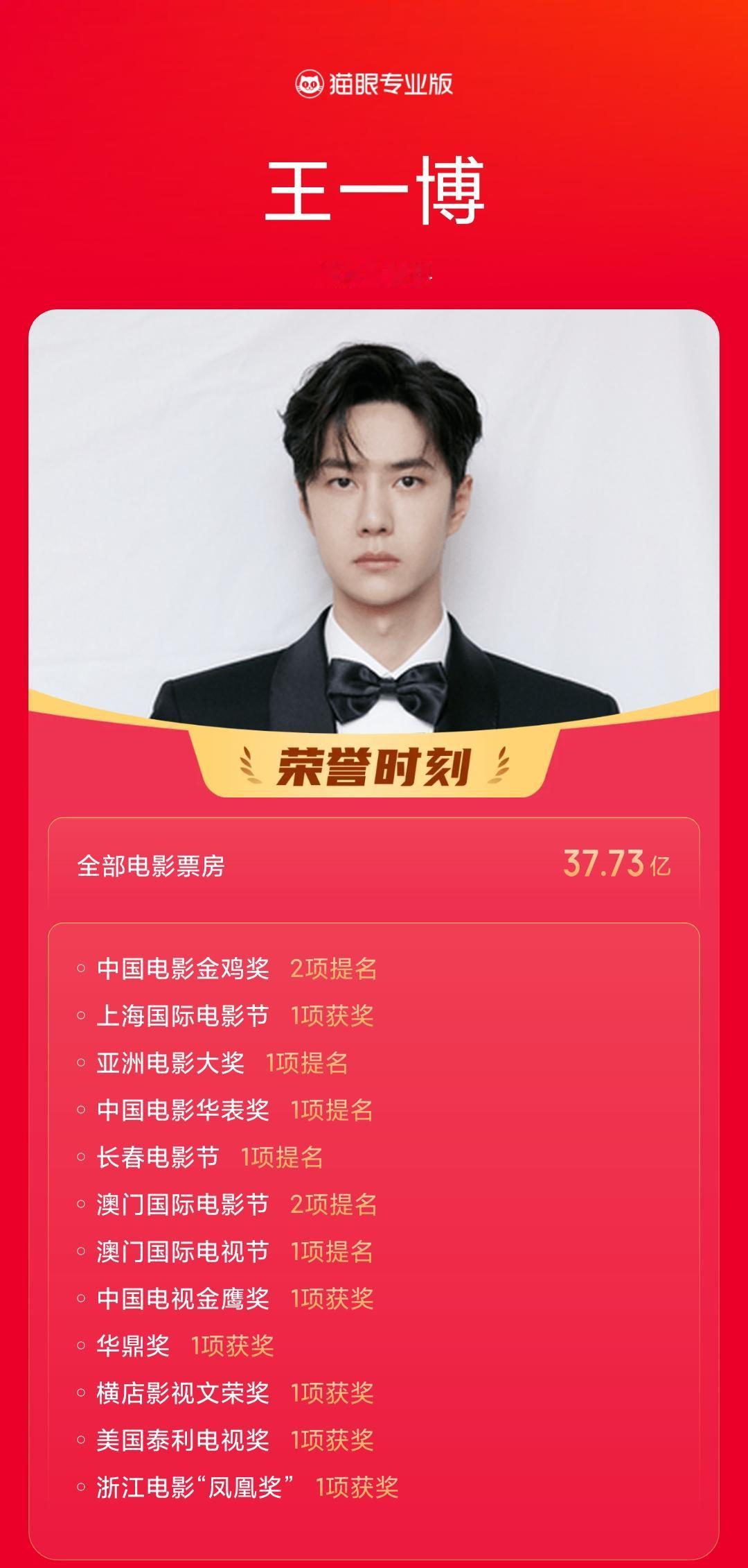 2024年王一博凭借主演电影《热烈》获得金鸡奖最佳男主角提名,且是95后首位金鸡奖影帝提名。