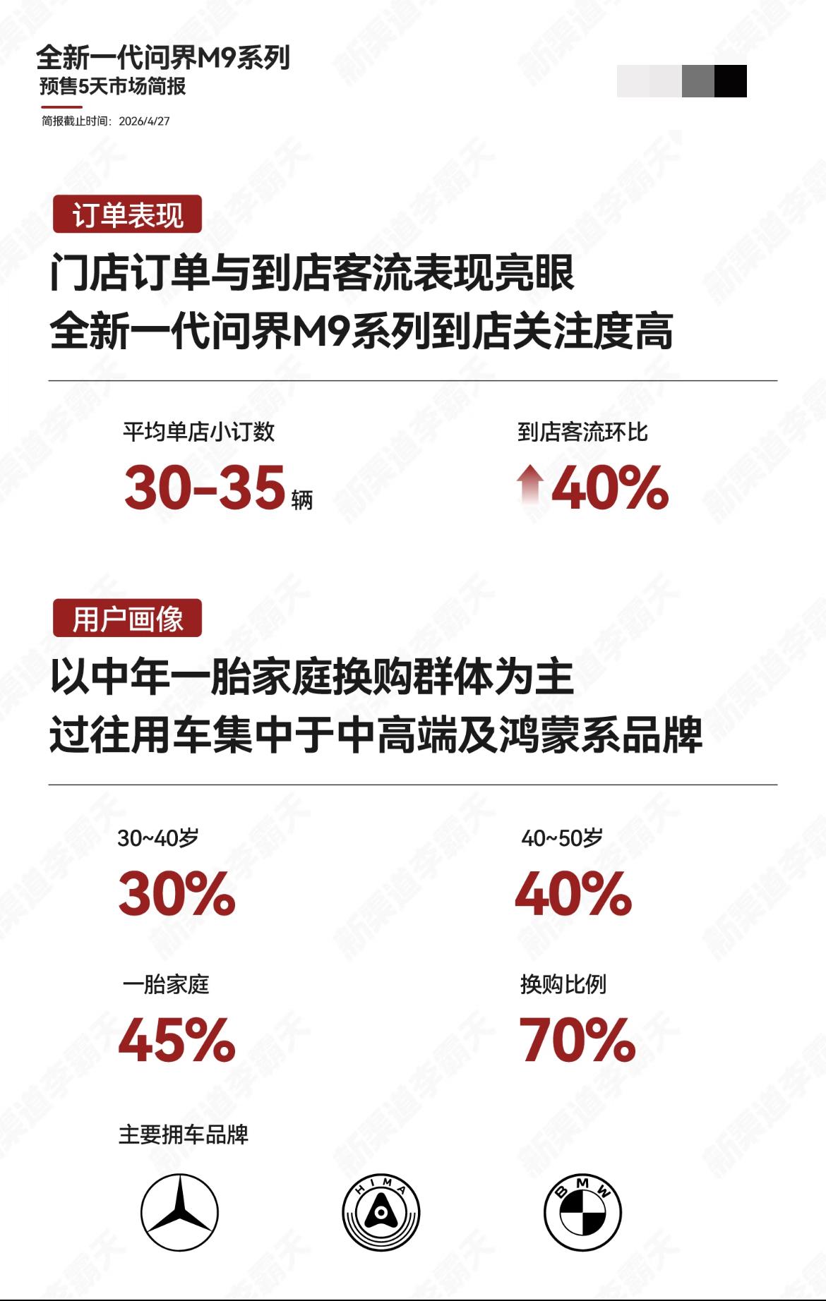 新款问界M9预售简报再现超强市场竞争力,高配版Multimate占比35%、单店订单30-35台。