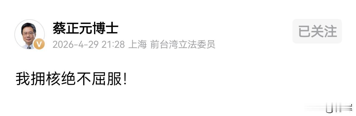 为此29号当天晚上,台岛蔡正元博士的社交帐号更新动态愤怒发声,声称蔡正元坚决拥核,绝不屈服。说之前绿营和蓝营一些别有用心的人,因为这个问题曾经打压过蔡正元,然而这绝对不会改变蔡正元的想法以及立场。