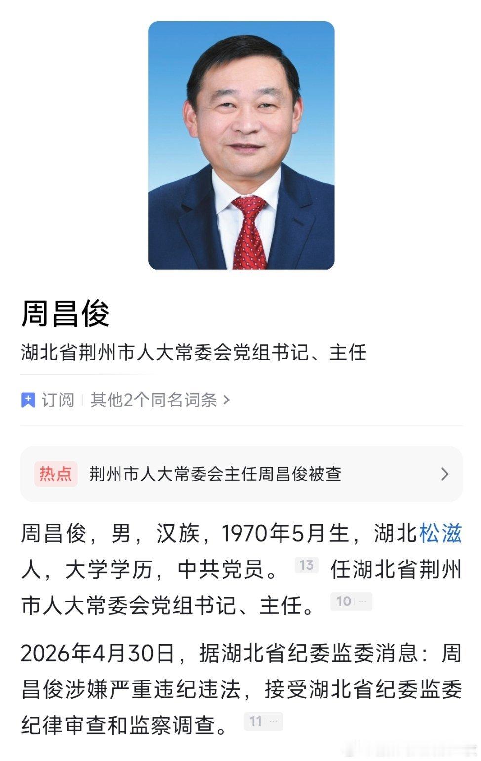 荆州市人大常委会党组书记、主任周昌俊涉嫌严重违纪违法,目前正接受湖北省纪委监委纪律审查和监察调查。