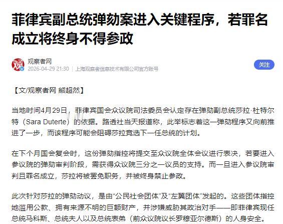 按照菲律宾的法律,接下来这弹劾案还要走流程,5 月初众议院全体会议会投票,只要有三分之一的议员赞成,就会移交参议院审理,到时候 24 名参议员里得有 16 票通过,弹劾才算真正生效。