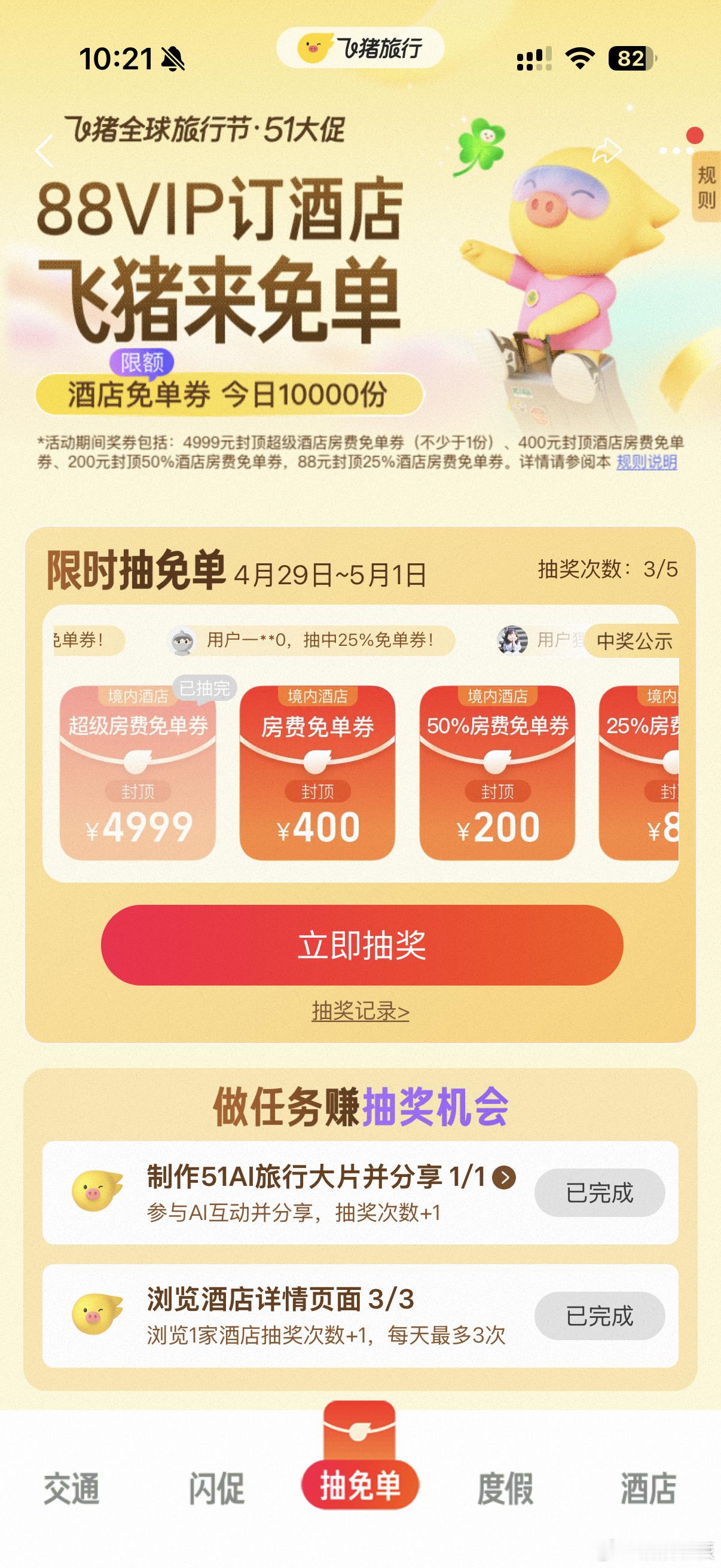 说实话去APP一看五一酒店普遍那么贵,纠结半天不如先去抽一把再说,抽中了再订也不迟。最后一个工作日了,赶紧冲uu们~飞猪免单五一前最后冲刺