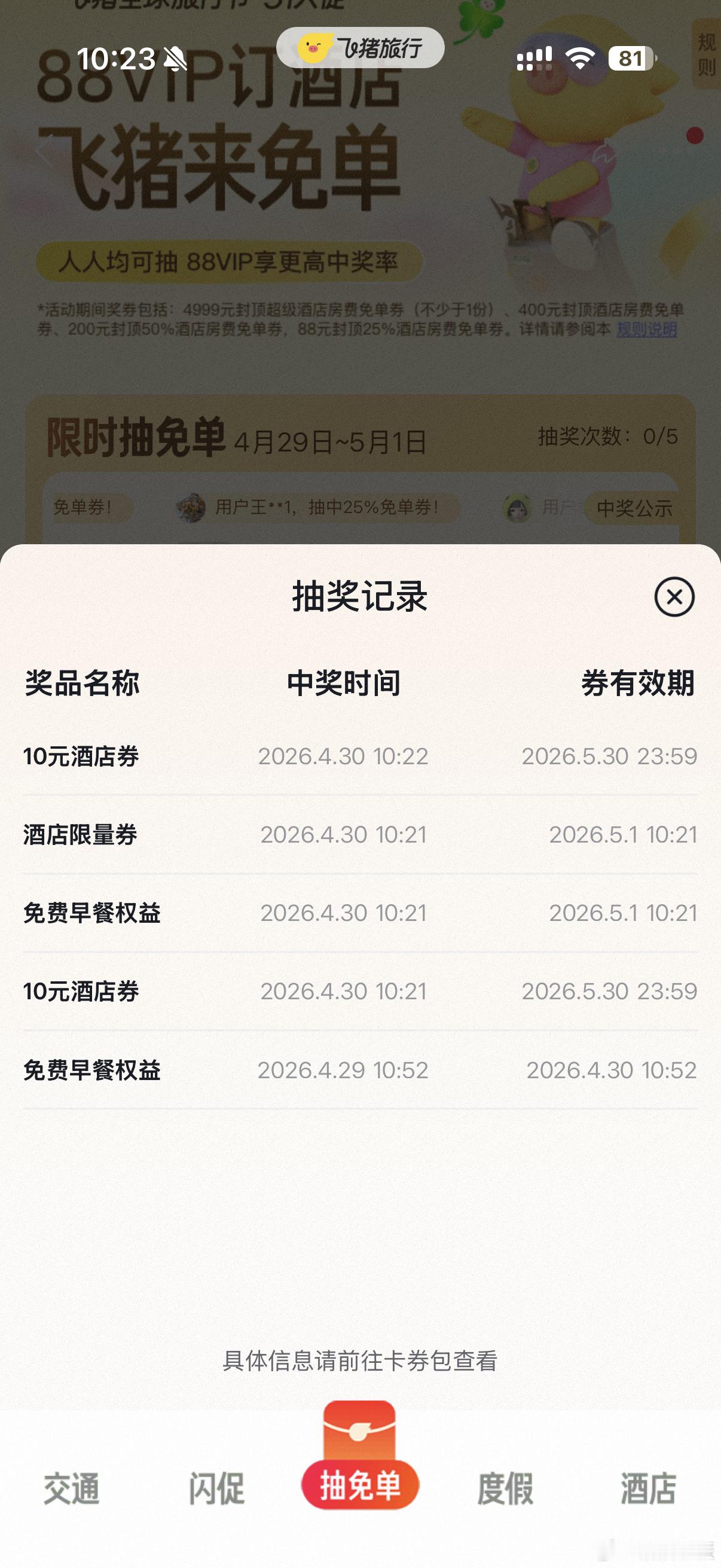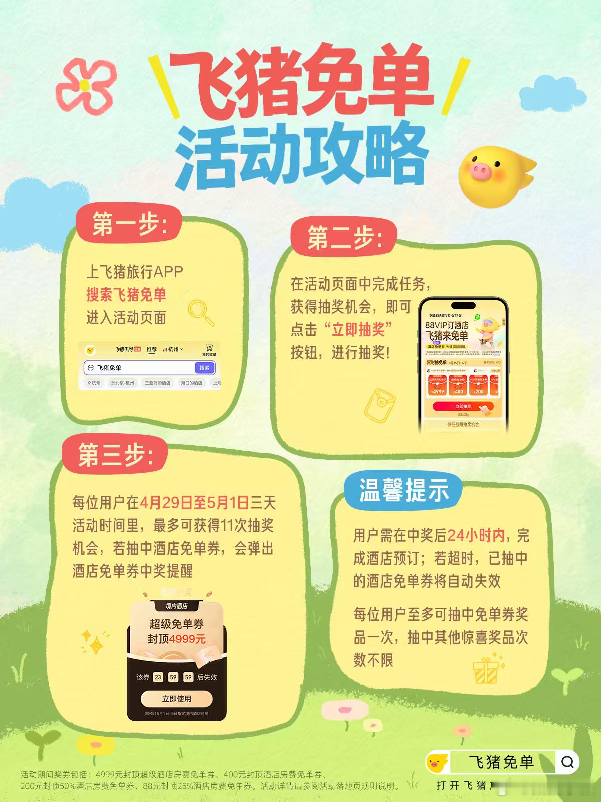 了解了一下,4.29–5.1连续三天去飞猪App,搜索"飞猪免单",一共11次抽奖机会,关键是先抽后订,不用先下单。