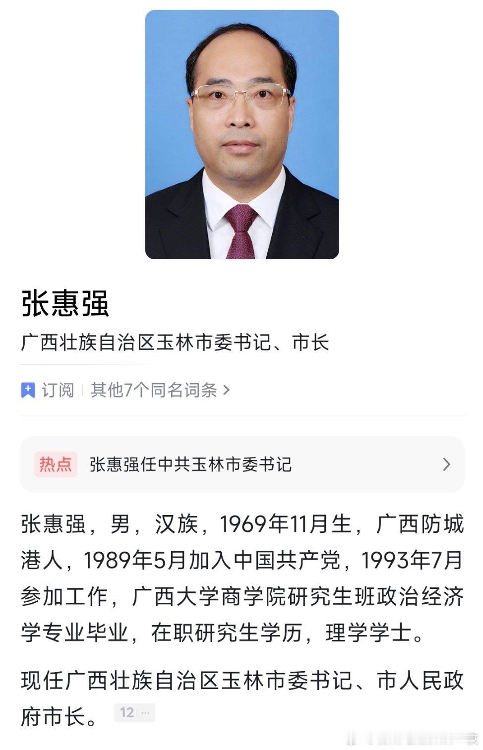 张惠强任玉林市委书记;李国忠任贺州市委书记。
