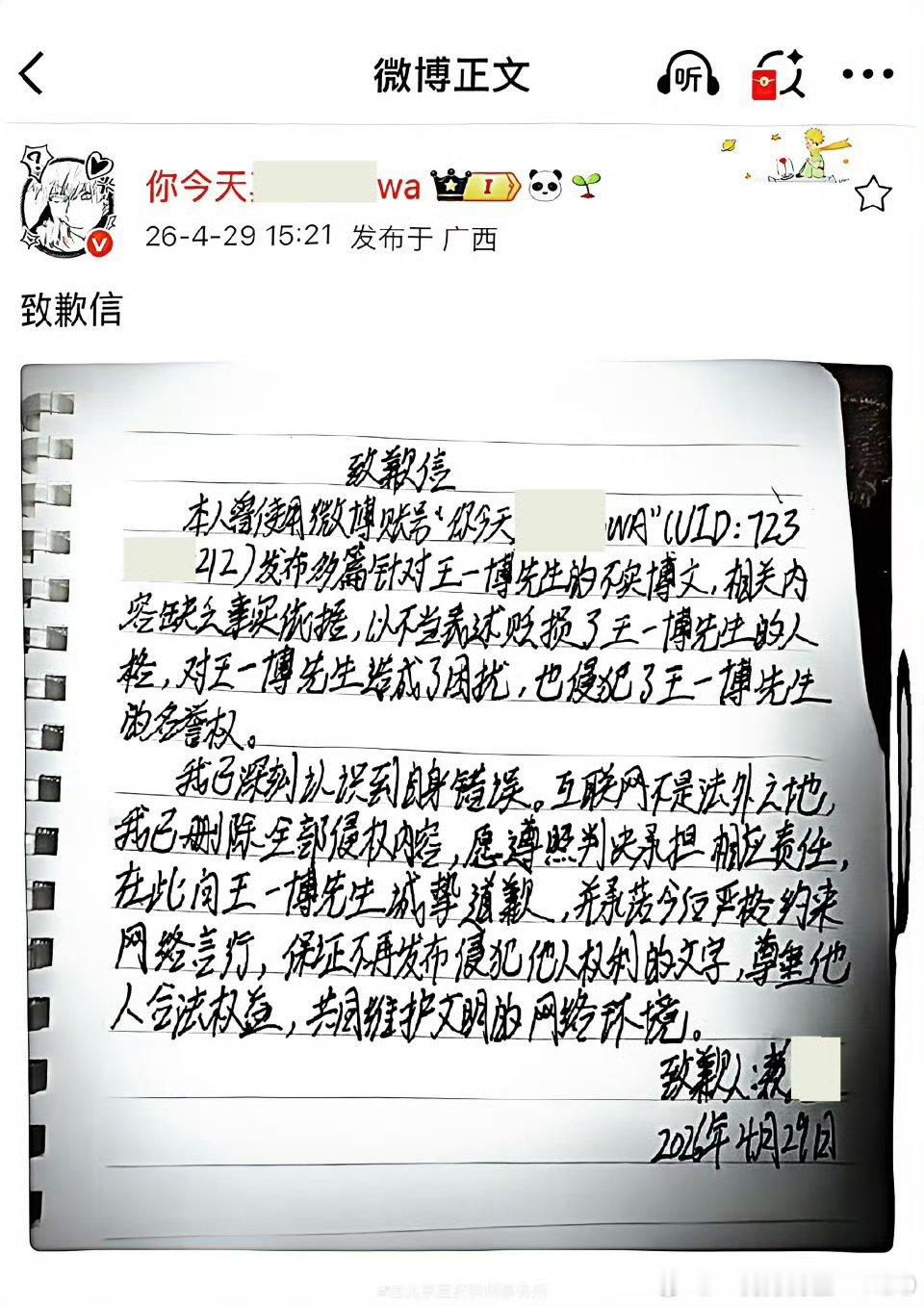以前嘴有多溅,现在字有多“飘”,法律教你好好做人,好好说话!王一博名誉权案被告手写致歉信支持王一博先生维权!