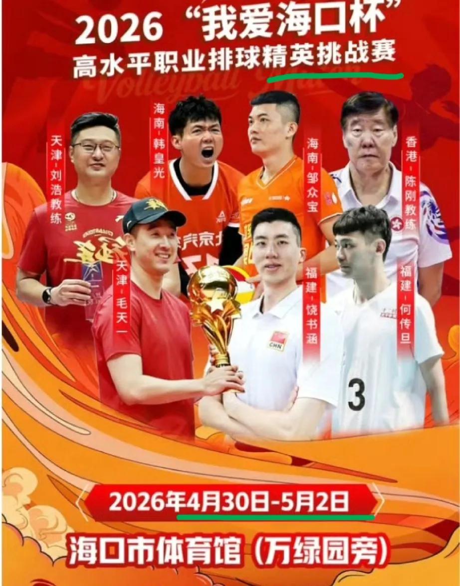 赛事官方发文写道,"我爱海口杯”排球精英挑战赛于今天开战!比赛时间4月30日-5月2日,每晚7点半海口体育馆!参赛队伍天津男排、福建男排、香港全运男排和海南明星队,将采用海南特色九人排球规则!