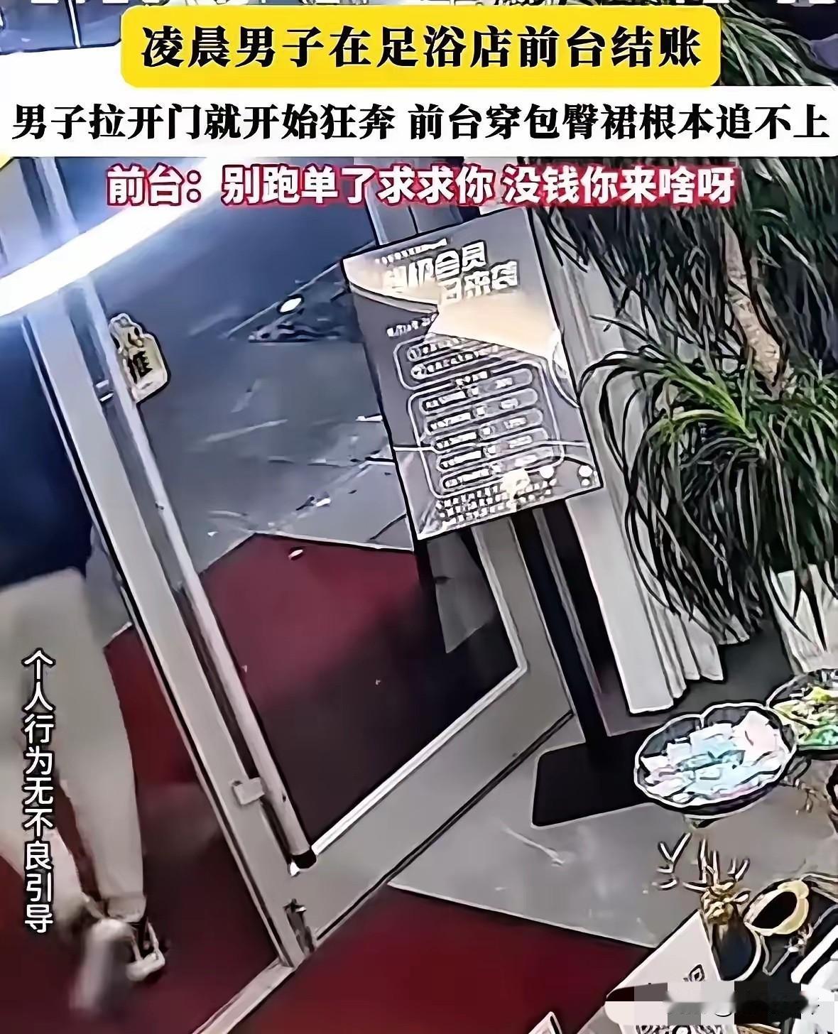 白嫖成功!男子凌晨去洗浴店做足疗,结账时看见女前台穿着紧身裙,行动不便,于是转头推开门就狂奔逃单,女前台愣了一脚赶紧出门查看,奈何自己和旁边的技师都穿高跟鞋追不上,在后面大喊:洗不起就别洗,没钱你来啥啊!最后越想越憋屈,把监控曝光!网友:这哥们在用实力证明,自己腿不软!