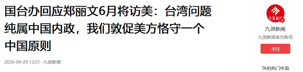 4 月 29 日国台办例行发布会上,记者就国民党主席郑丽文 6 月拟访美一事提问。据悉,郑丽文计划赴美与美方商谈所谓 “路线图”,还声称台湾不应陷入大陆与美国 “二选一” 的误区。