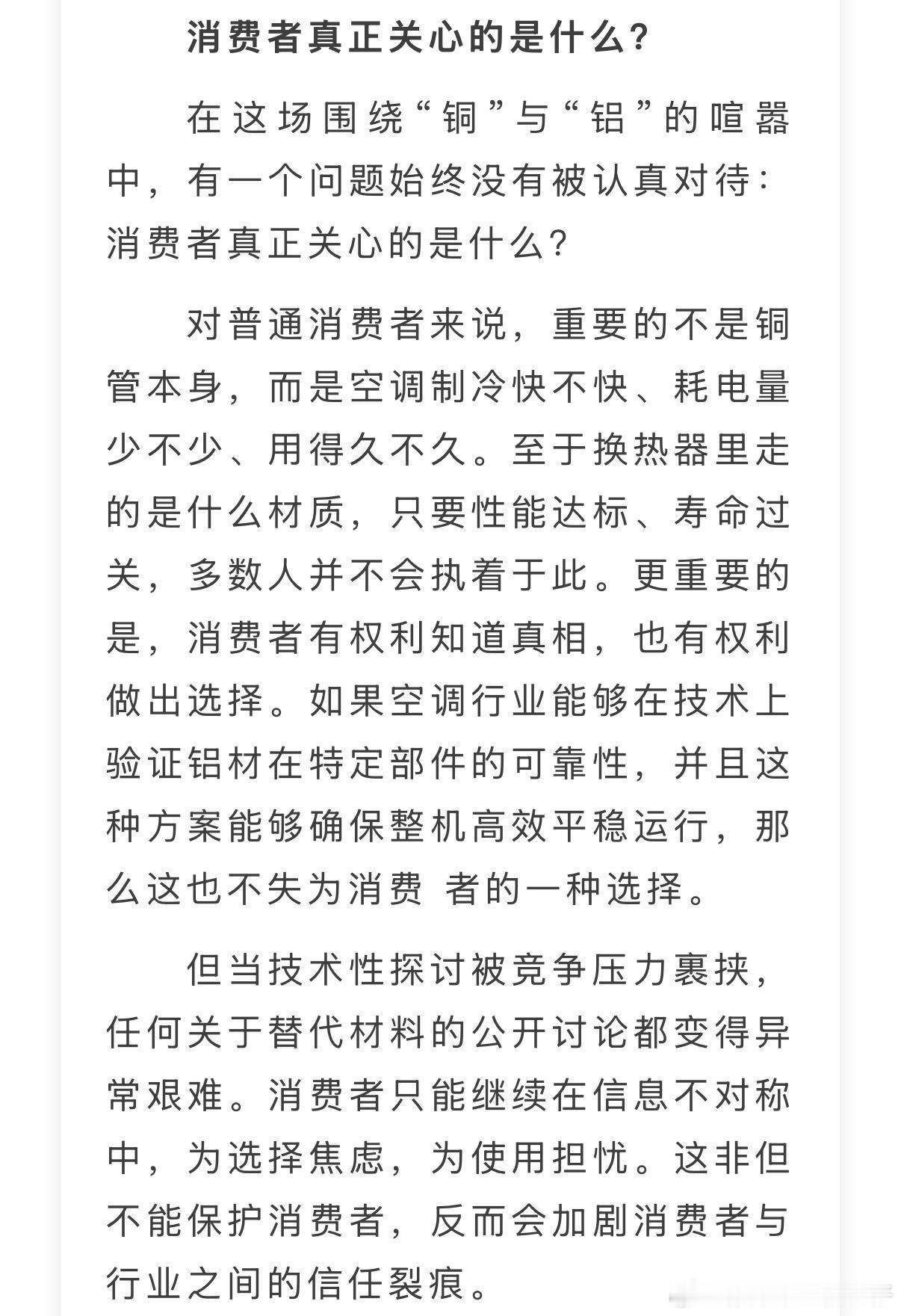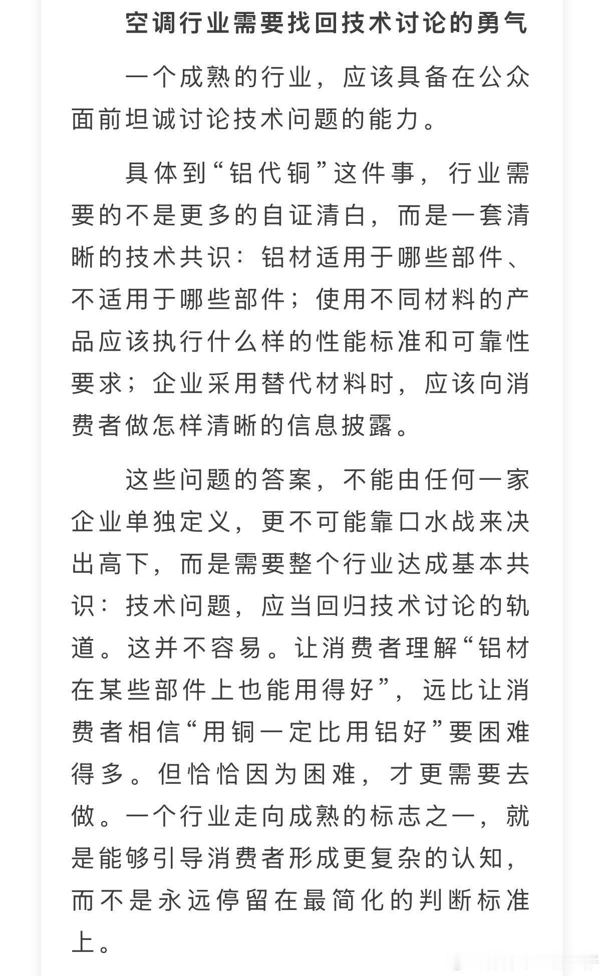 继董明珠后海尔高管首谈铝代铜问题海尔高管说把心思放到用户身上喧嚣行业里,清醒发言格外珍贵。面对全网热议的铝代铜争议,海尔跳出行业内卷,坦言企业本心从不是跟风争论,用户永远是品牌前行的灯塔,守住品质底线、倾听用户需求,才是中国制造长久发展的正道