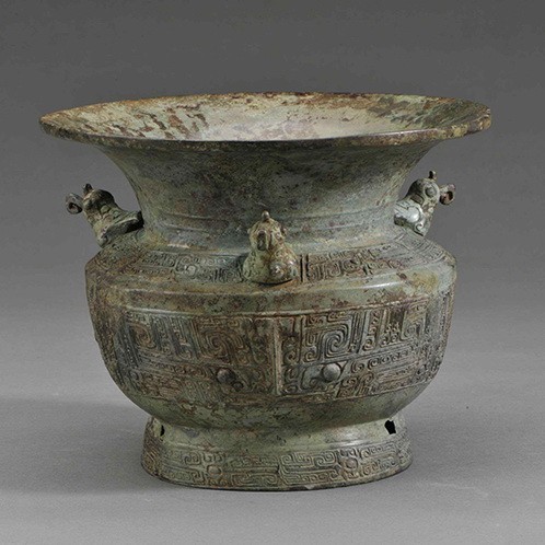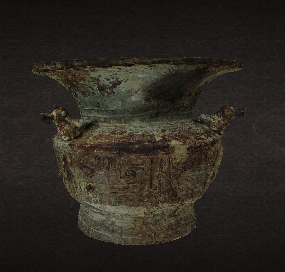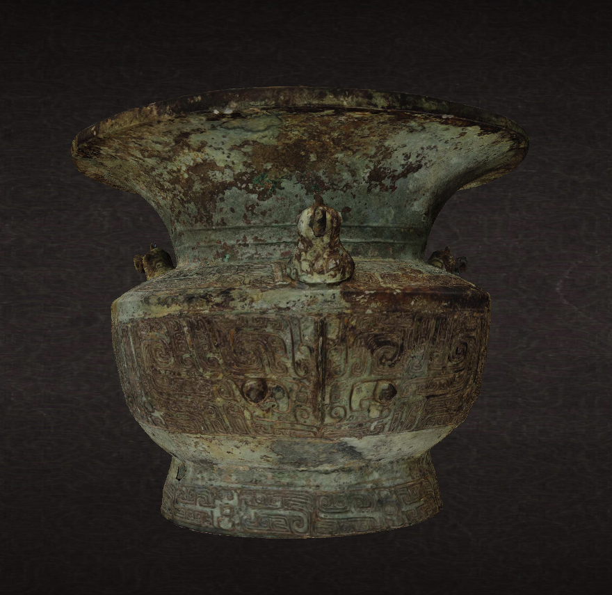 每天一件青铜器 河南新乡平原博物馆藏1952年辉县褚邱出土商晚期:三鸟兽面纹大口尊. 在肩部设置小鸟通常是南方铜器常用的做法,这件是非常少见的殷墟风格的设置肩部卧鸟的器物.另外要说的是目前博物馆官网非常流行的3D视角, 比如图3-4的截图. 3D缩放无死角自然是先进的,但总感觉原始贴图质量一般...