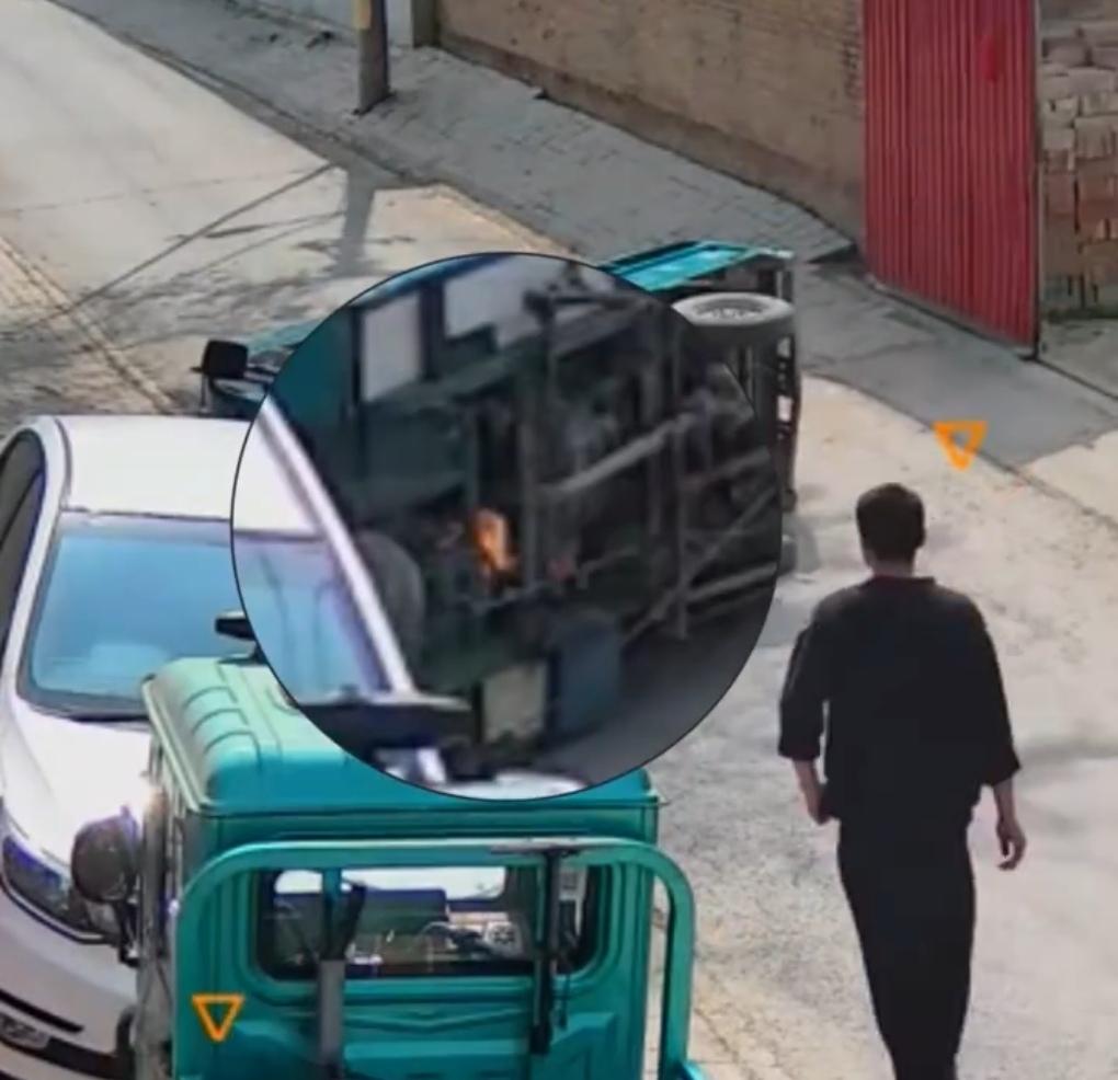 日前,河北沧州任丘市辛中驿镇铁匠庄村,村民李亚飞正和朋友在家门口聊天,突然看到一辆三轮车拐弯时失去重心,一下子侧翻在地。