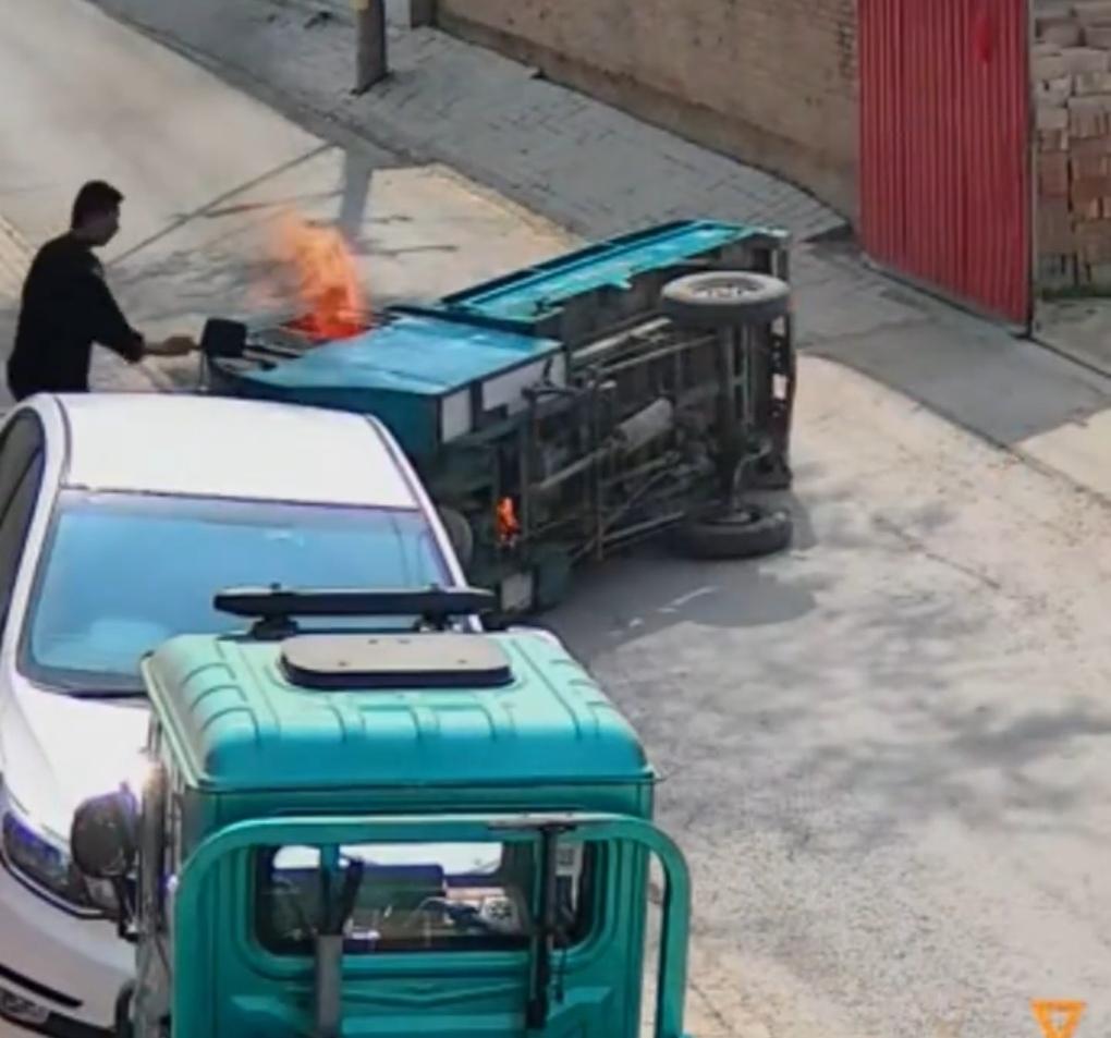 李亚飞刚想上前查看情况,眼前的一幕让他瞬间心头一紧:三轮车油箱破裂,火苗瞬间窜了起来,几秒钟的功夫,整个驾驶室就被大火和浓烟彻底吞没,被困在车里的车主不停发出痛苦的哀嚎。