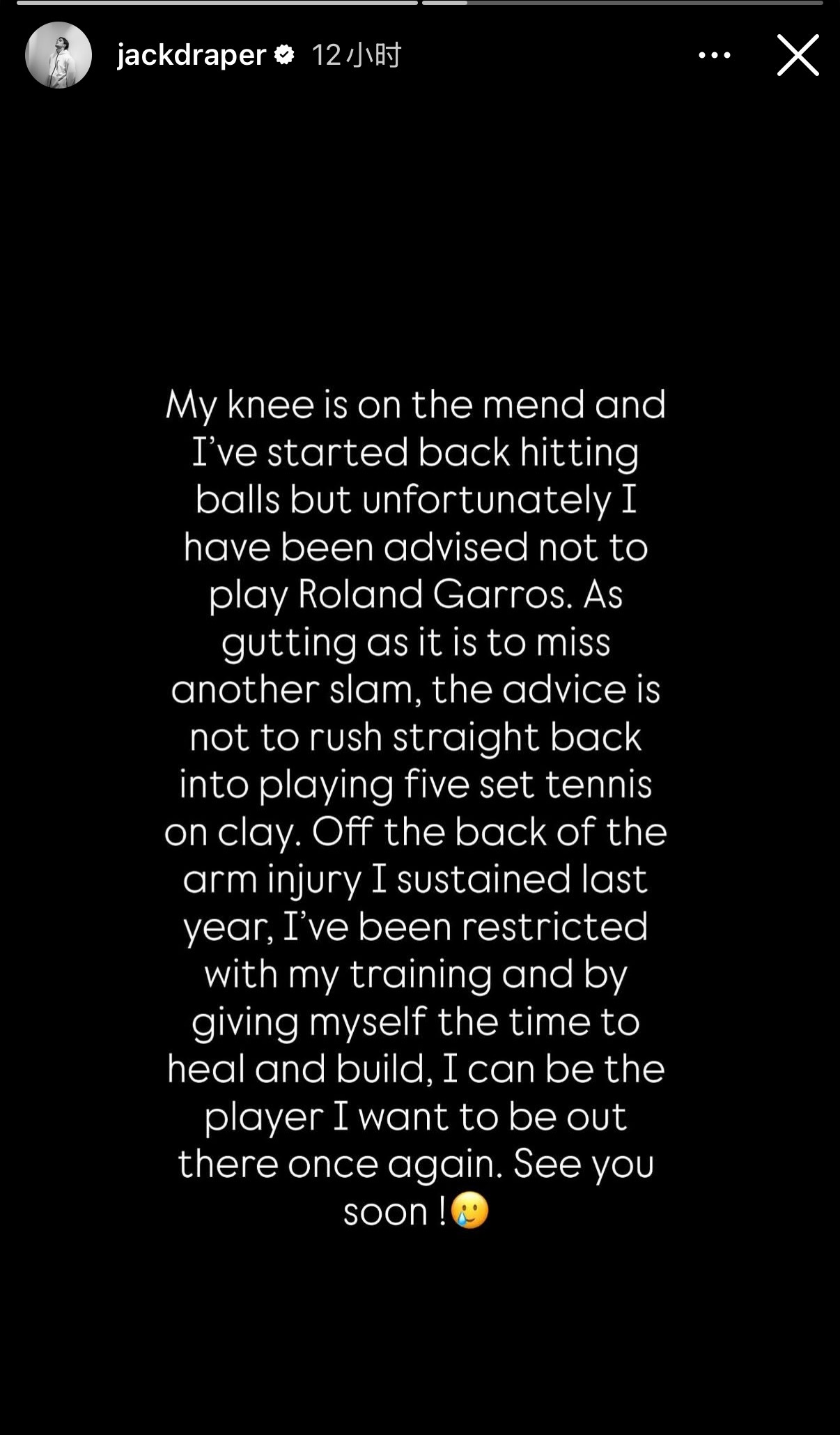 “我的膝盖正在好转,我也已经开始恢复击球训练。但遗憾的是,医生建议我不要参加法网。虽然错过又一项大满贯赛事令人痛心,但医生的建议是不要急于在红土场上回归五盘三胜制的比赛。由于去年手臂受伤,我的训练一直受到限制。而通过给自己足够的时间去康复和积累,我才能再次成为自己想要成为的那个球员。我们很快再见!”